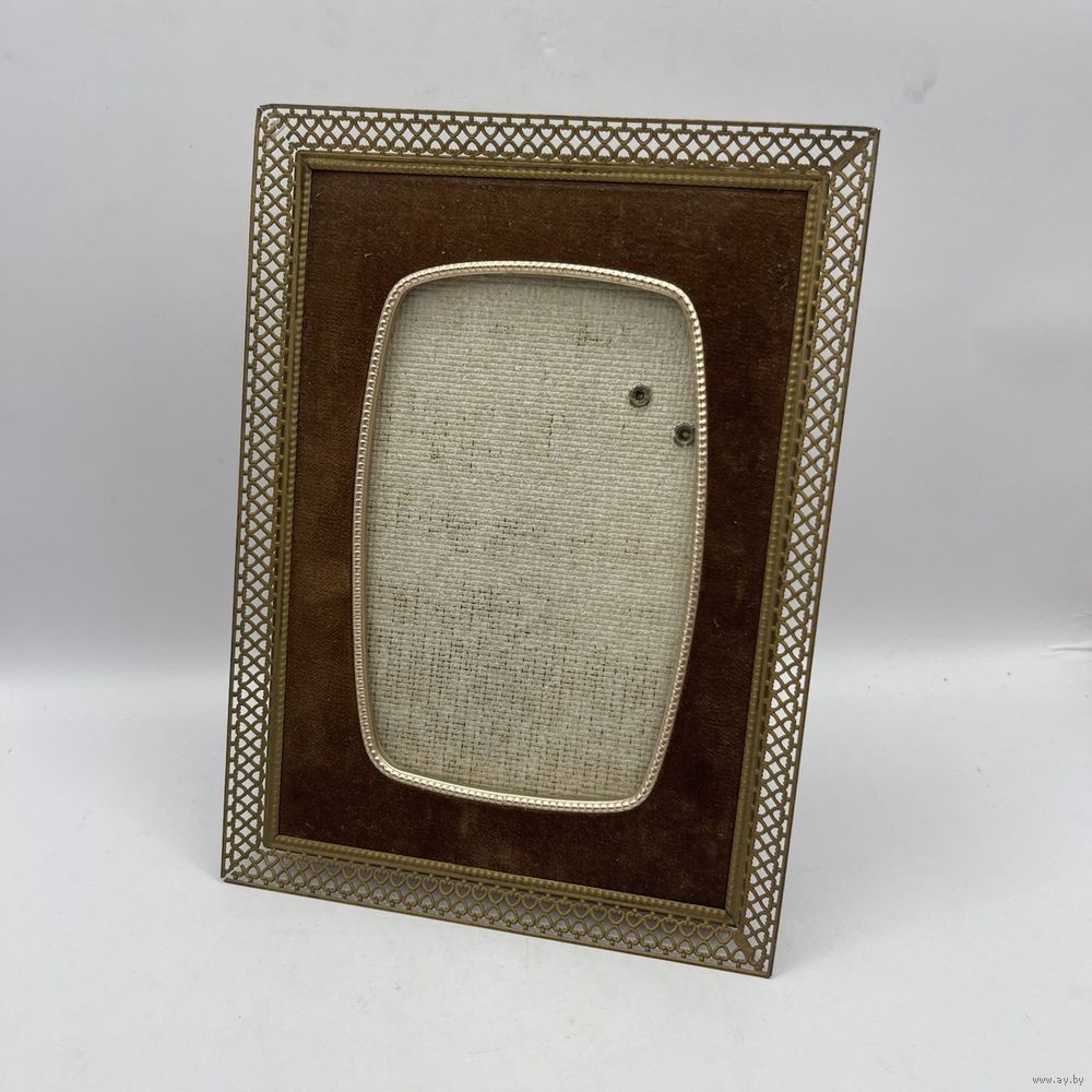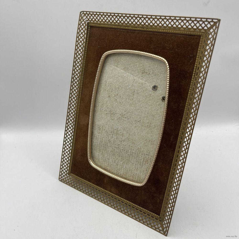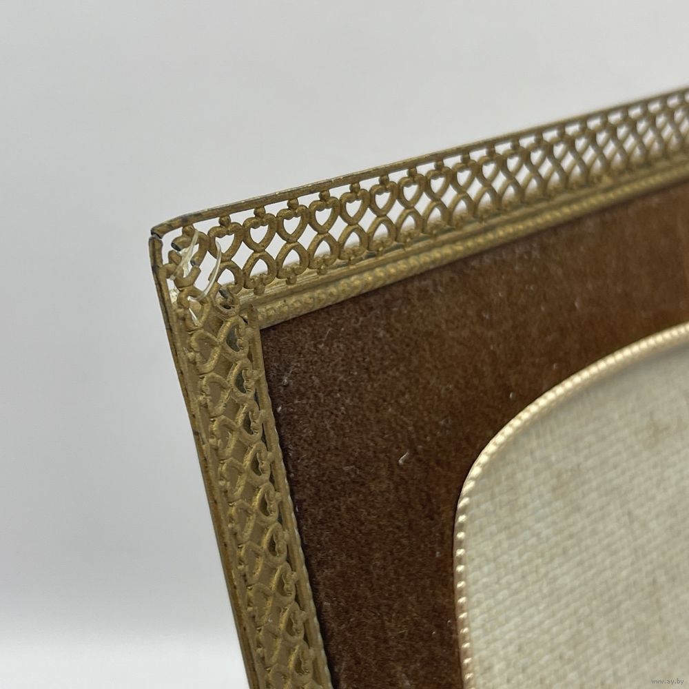Антикварная настольная фоторамка из латуни с ажурным прорезным узором и бархатным паспарту, под стеклом. Италия. 1950-е г.г. Размещение вертикальное/горизонтальное. Размер 14 х 19 см, под фото 8,5 х 12,5 см. Естественная патина. Следы реставрации в месте спайки в углу, на внешний вид не влияет (см. фото, учтено в цене).