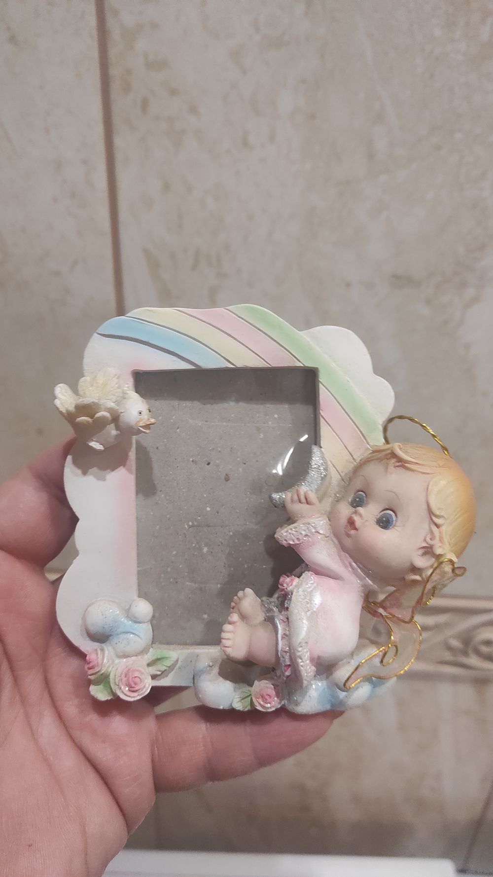Рамка для фото с ангелом и птичкой, размер 10,5 на 10,5 см. Очень красивая.