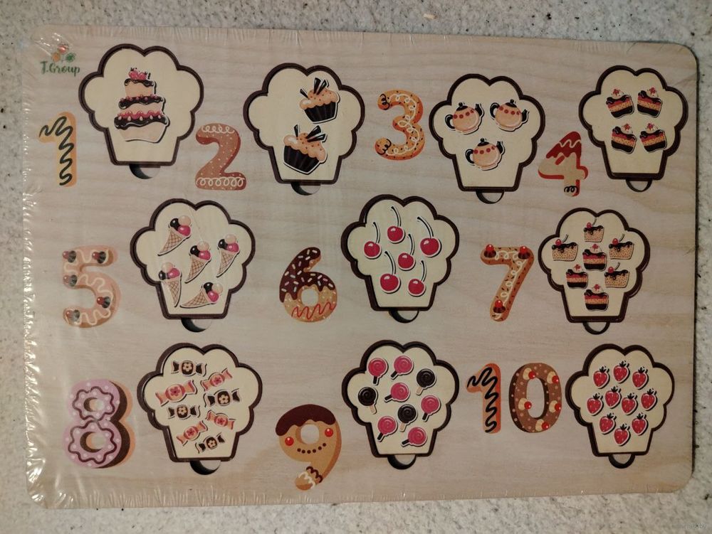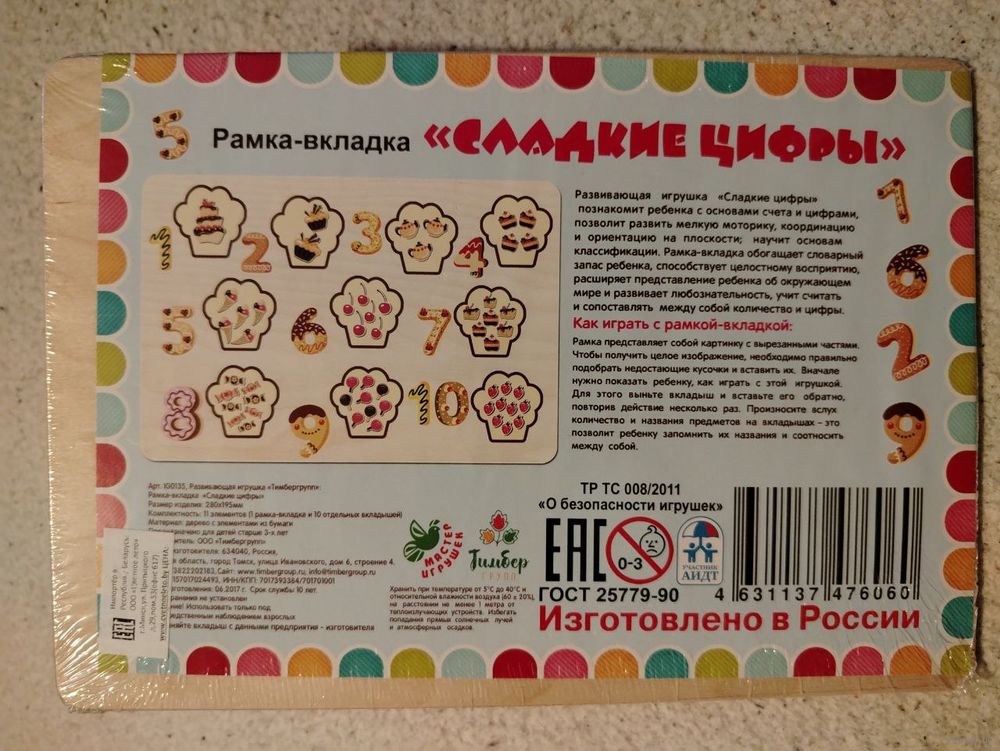 В деревянной рамке имеются углубления, по которым раскладываются специальные вкладыши со сладостями в соответствии с цифрами. Игра поможет развить логическое мышление и внимание.