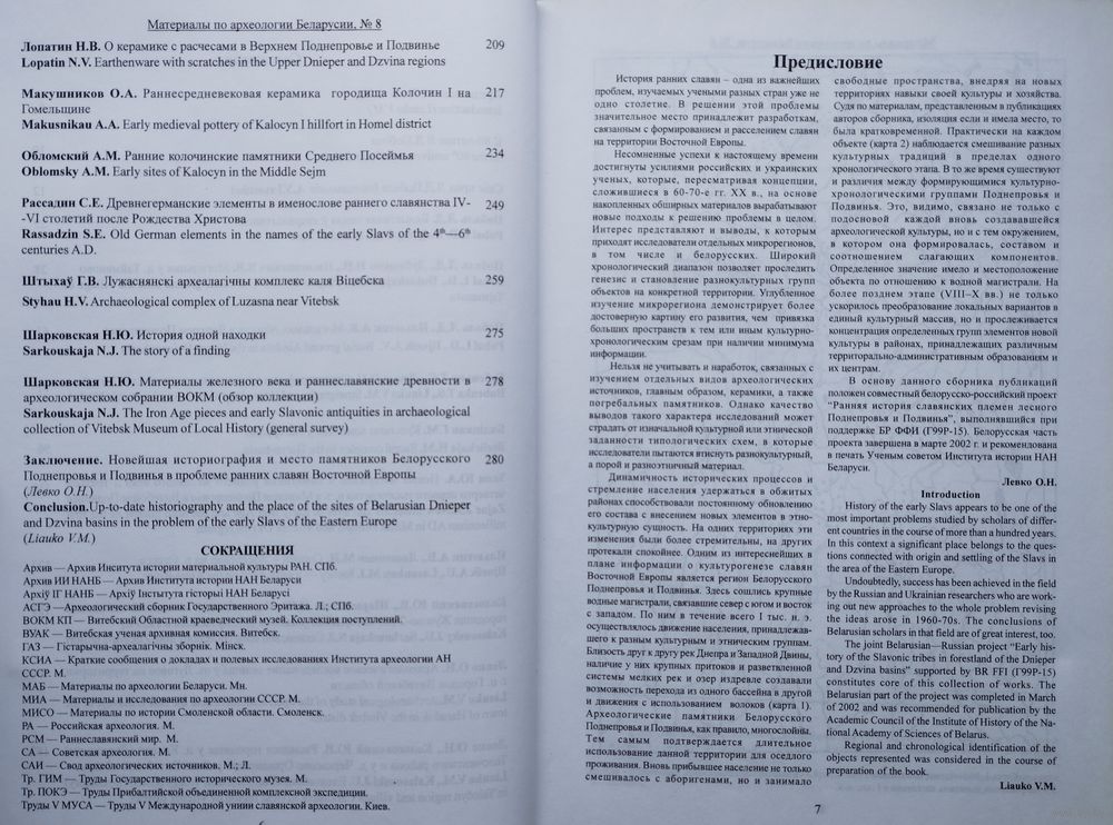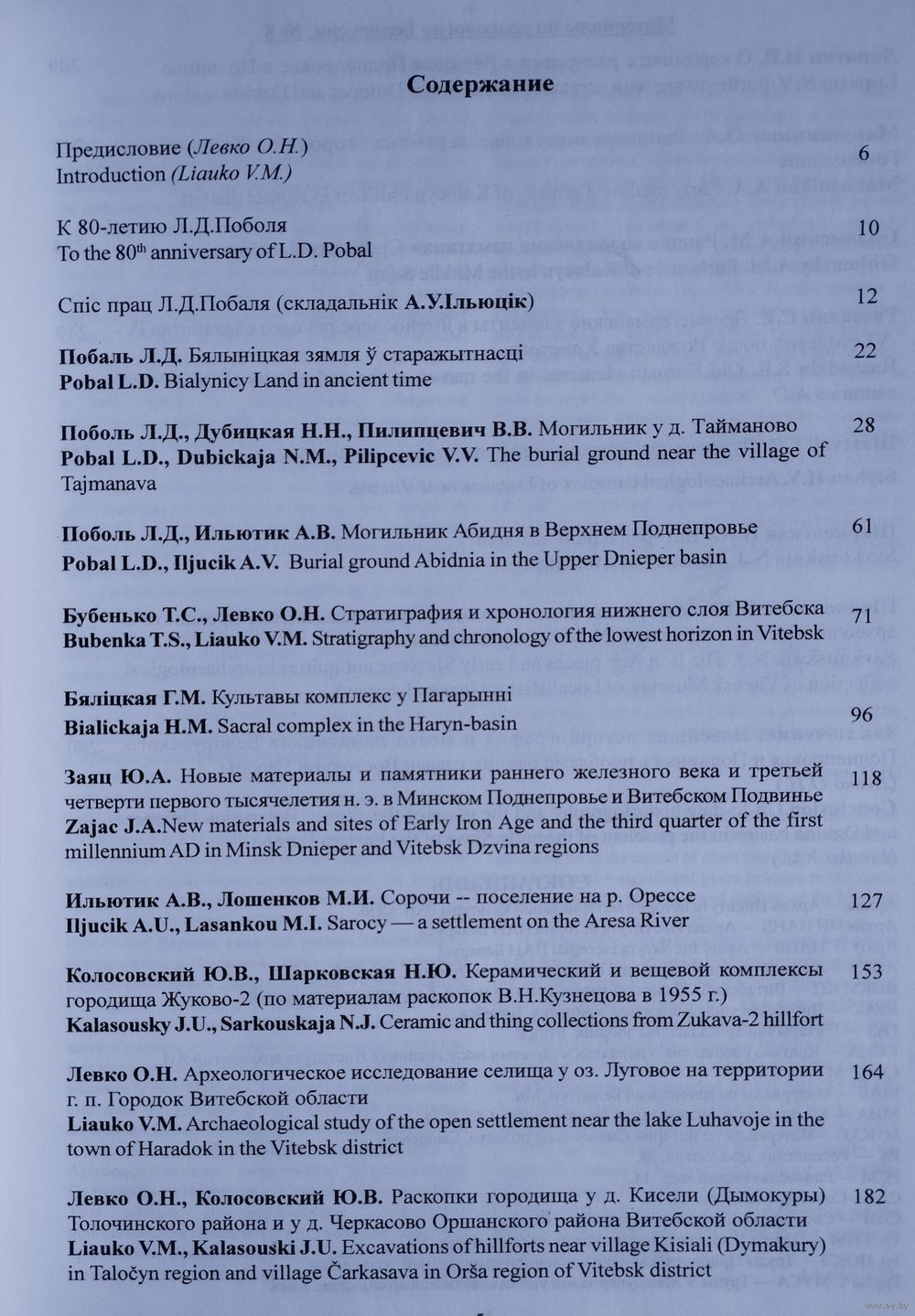 Большой энциклопедический формат. Тираж 230 экз. 294 стр. 8-й выпуск серии «Материалы по археологии Беларуси», посвященный 80-летию археолога Л. Д. Поболя. Сборник содержит материалы исследований поселений и могильников IV–VIII вв. н.э., освещая вопросы этногенеза славян, их расселения и культуры на территории Восточной Беларуси.
