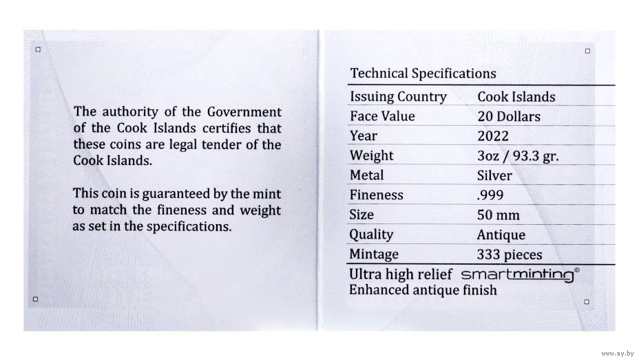 Детализация и высокий рельеф монеты достигнут благодаря применению уникальной технологии чеканки Smartminting.