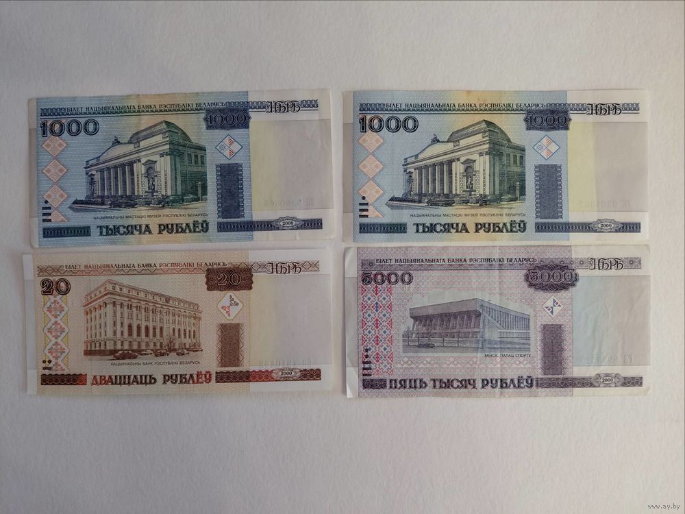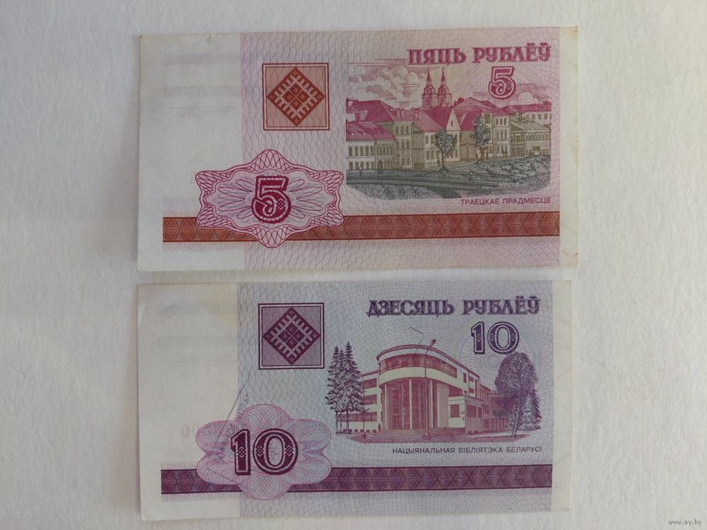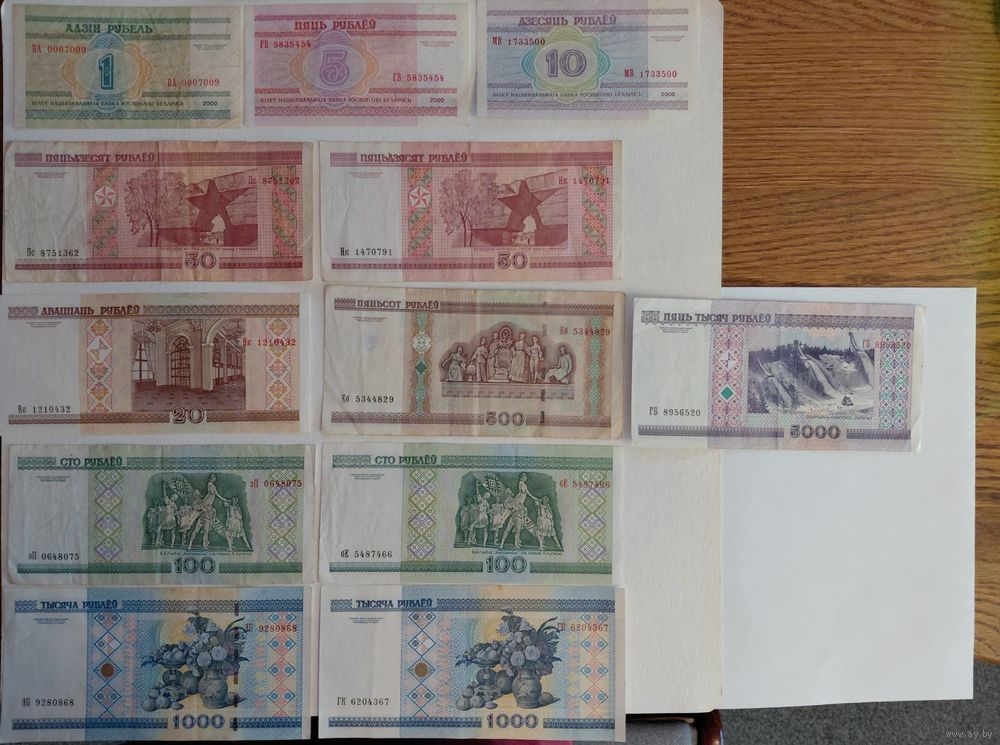 1 000 и 100 рублей до модификации и после модификации (с защитной полосой). 50 рублей в 2010 г. Слово «пяцьдзесят» заменили на «пяцьдзясят».