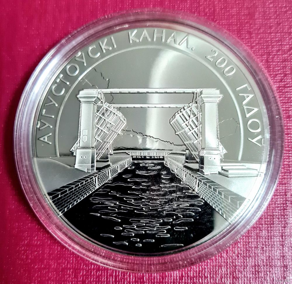по кругу вверху – рельефное изображение Государственного герба Республики Беларусь и надпись: РЭСПУБЛІКА БЕЛАРУСЬ; в центре изображение Августовского канала на карте Гродненской области; внизу – номинал 20 РУБЛЁЎ (на серебряной) и 1 РУБЕЛЬ (на медно-никелевой) справа – проба сплава, слева – год чеканки.