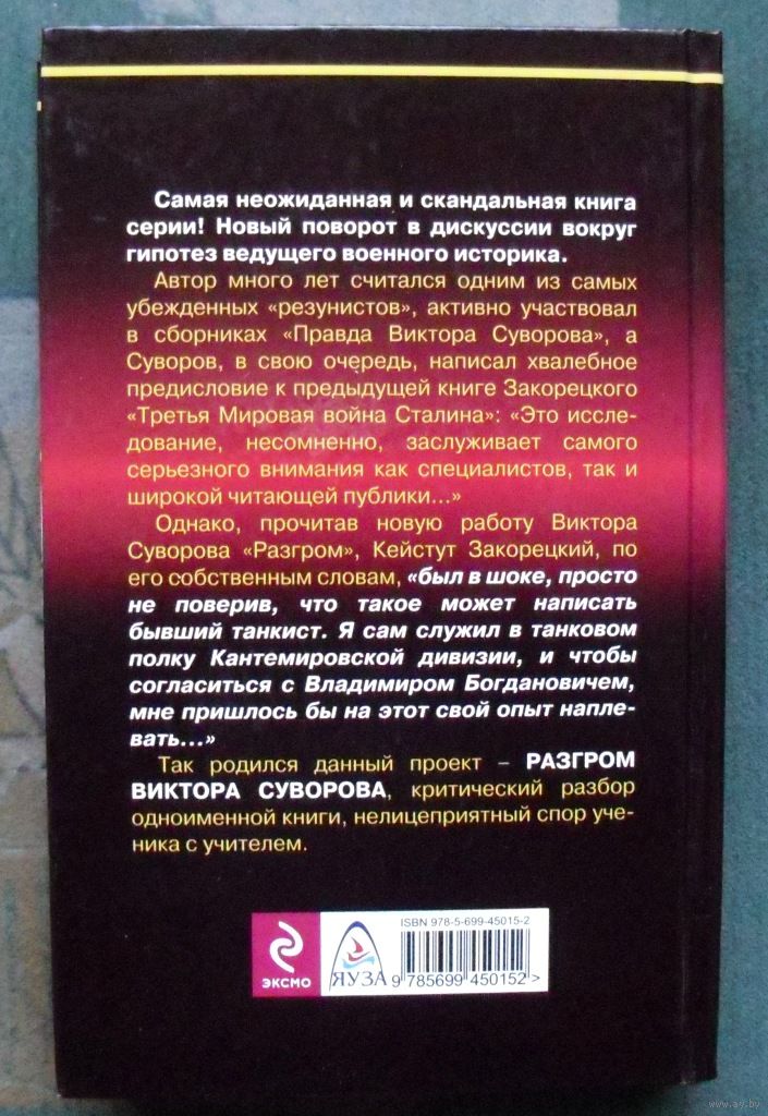 Самая неожиданная и скандальная книга серии! Новый поворот в дискуссии вокруг гипотез ведущего военного историка. Автор много лет считался одним из самых убежденных `резунистов`, активно участвовал в сборниках `Правда Виктора Суворова`, а Суворов, в свою очередь, написал хвалебное предисловие к предыдущей книге Закорецкого `Третья Мировая война Сталина`: `Это исследование, несомненно, заслуживает самого серьезного внимания как специалистов, так и широкой читающей публики...`. Однако, прочитав новую работу Виктора Суворова `Разгром`, Кейстут Закорецкий, по его собственным словам, `был в шоке, просто не поверив, что такое может написать бывший танкист. Я сам служил в танковом полку Кантемировской дивизии, и чтобы согласиться с Владимиром Богдановичем, мне пришлось бы на этот свой опыт наплевать...`. Так родился данный проект - Разгром Виктора Суворова, критический разбор одноименной книги, нелицеприятный спор ученика с учителем.
