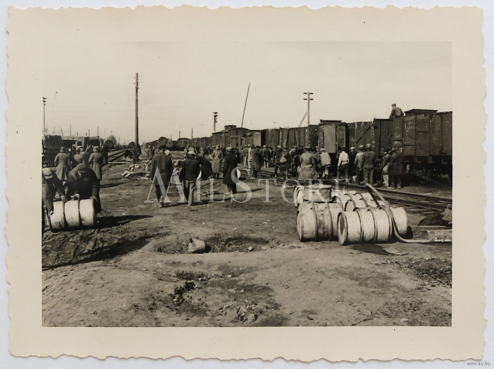 Разгрузка вагонов с топливом, с последующей погрузкой бочек с горючим в грузовые автомобили. Станция Чудово 1-Московская, г. Чудово Новгородская область. 1941 год. Смотрите другие фотографии этой серии. Размер около 6,8 см. х 9,2 см.