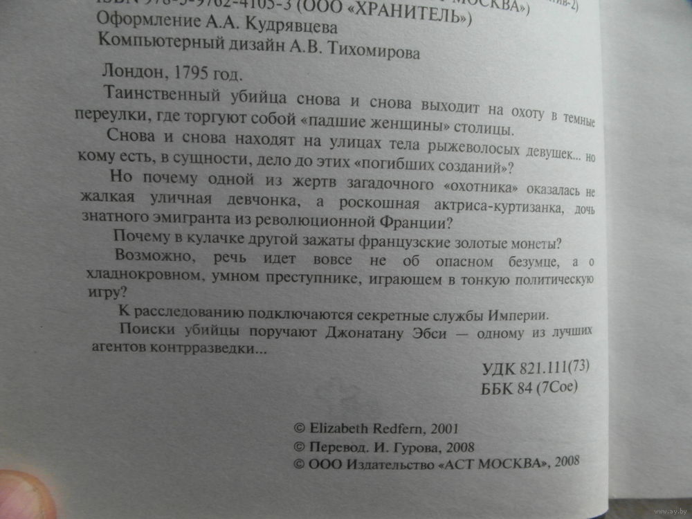 Лондон, 1795 год. Таинственный убийца снова и снова выходит на охоту в темные переулки, где торгуют собой `падшие женщины` столицы. Снова и снова находят на улицах тела рыжеволосых девушек... но кому есть, в сущности, дело до этих `погибших созданий`? Но почему одной из жертв загадочного `охотника` оказалась не жалкая уличная девчонка, а роскошная актриса-куртизанка, дочь знатного эмигранта из революционной Франции? Почему в кулачке другой зажаты французские золотые монеты? Возможно, речь идет вовсе не об опасном безумце, а о хладнокровном, умном преступнике, играющем в тонкую политическую игру? К расследованию подключаются секретные службы Империи. Поиски убийцы поручают Джонатану Эбси - одному из лучших агентов контрразведки...