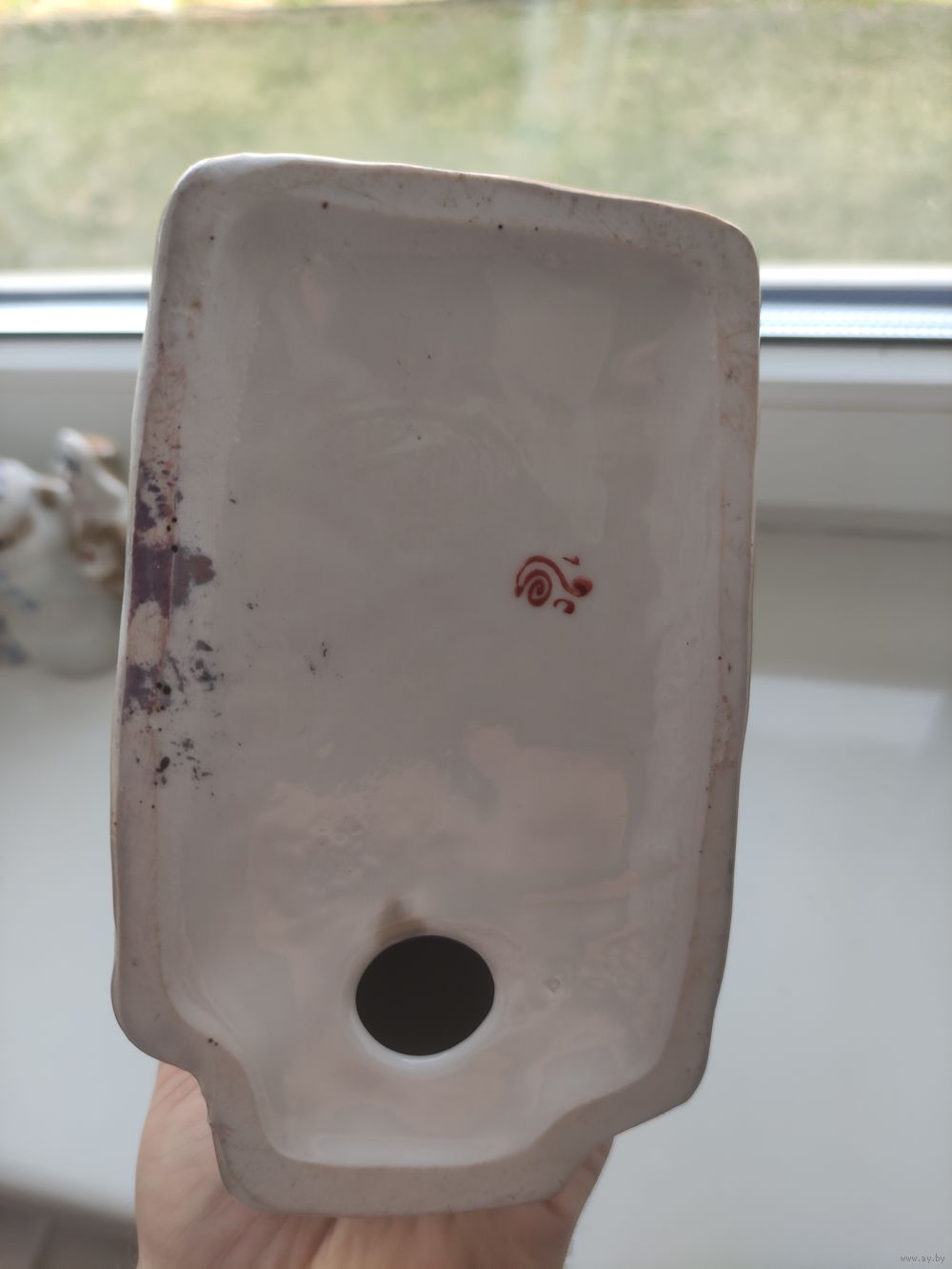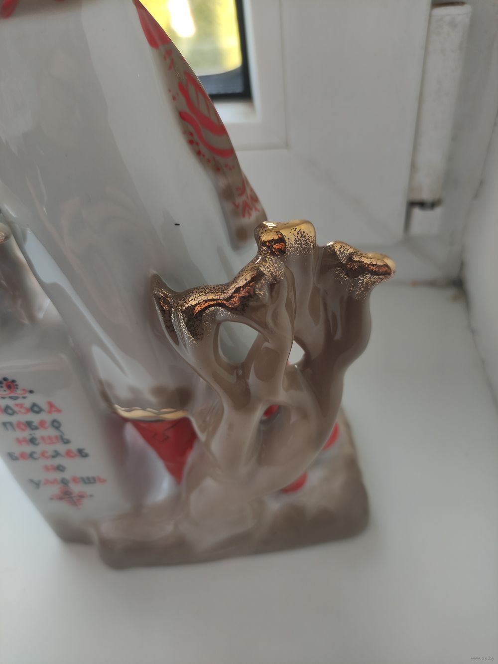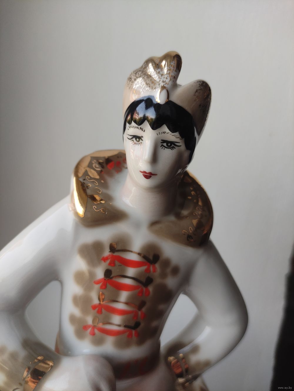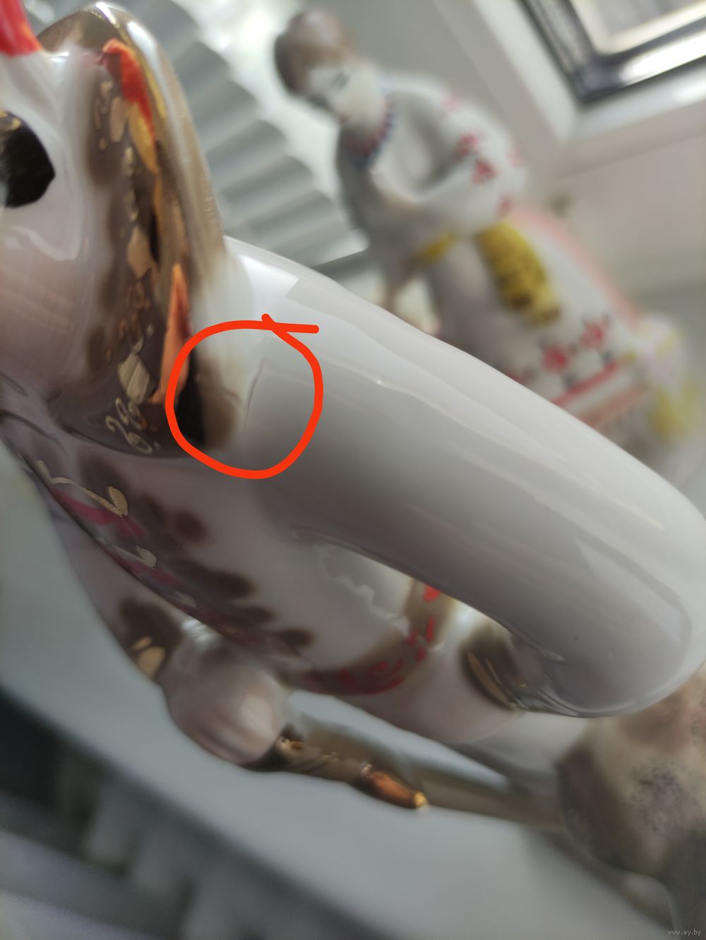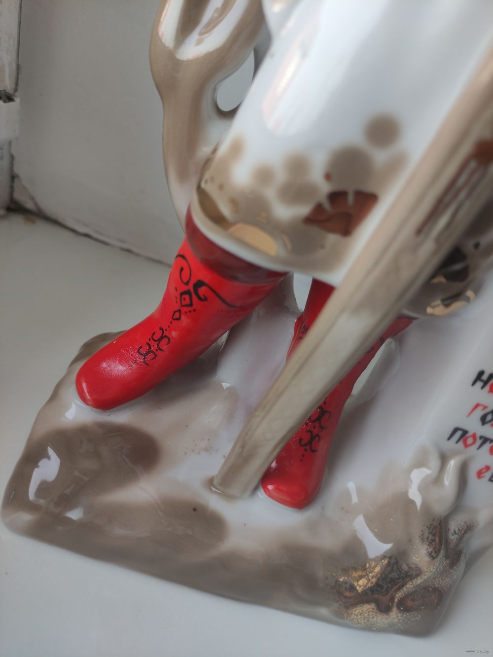 Статуэтка с красным клеймом (1сорт) не смотря на это имеет небольшую печную трещину. Позолота в хорошем состоянии. Сколов и следов рестоврации нет. Большой размер: 14 см. x 33 см. Просьба: не делать необдуманных ставок.