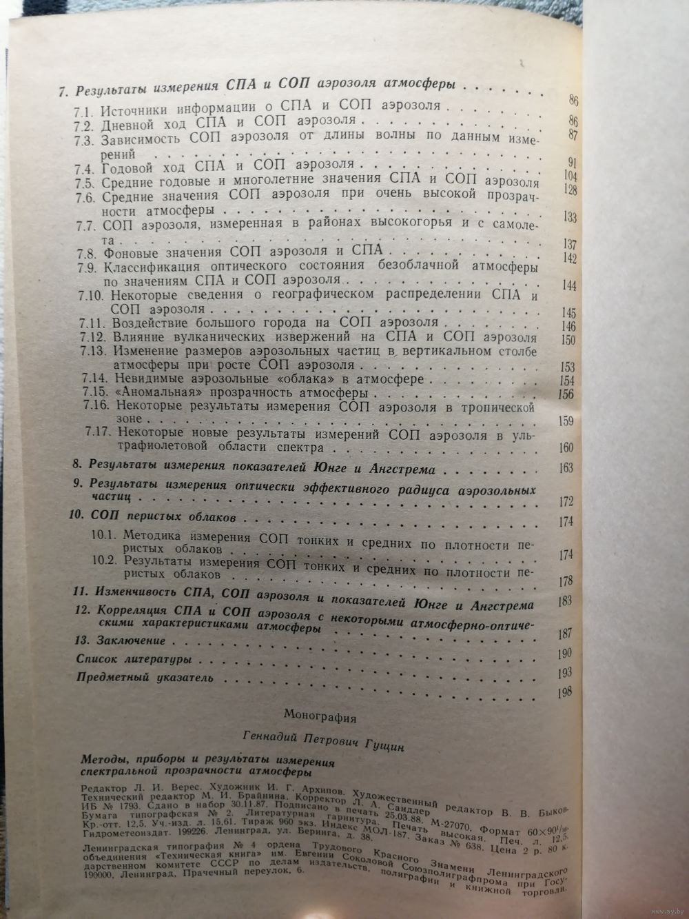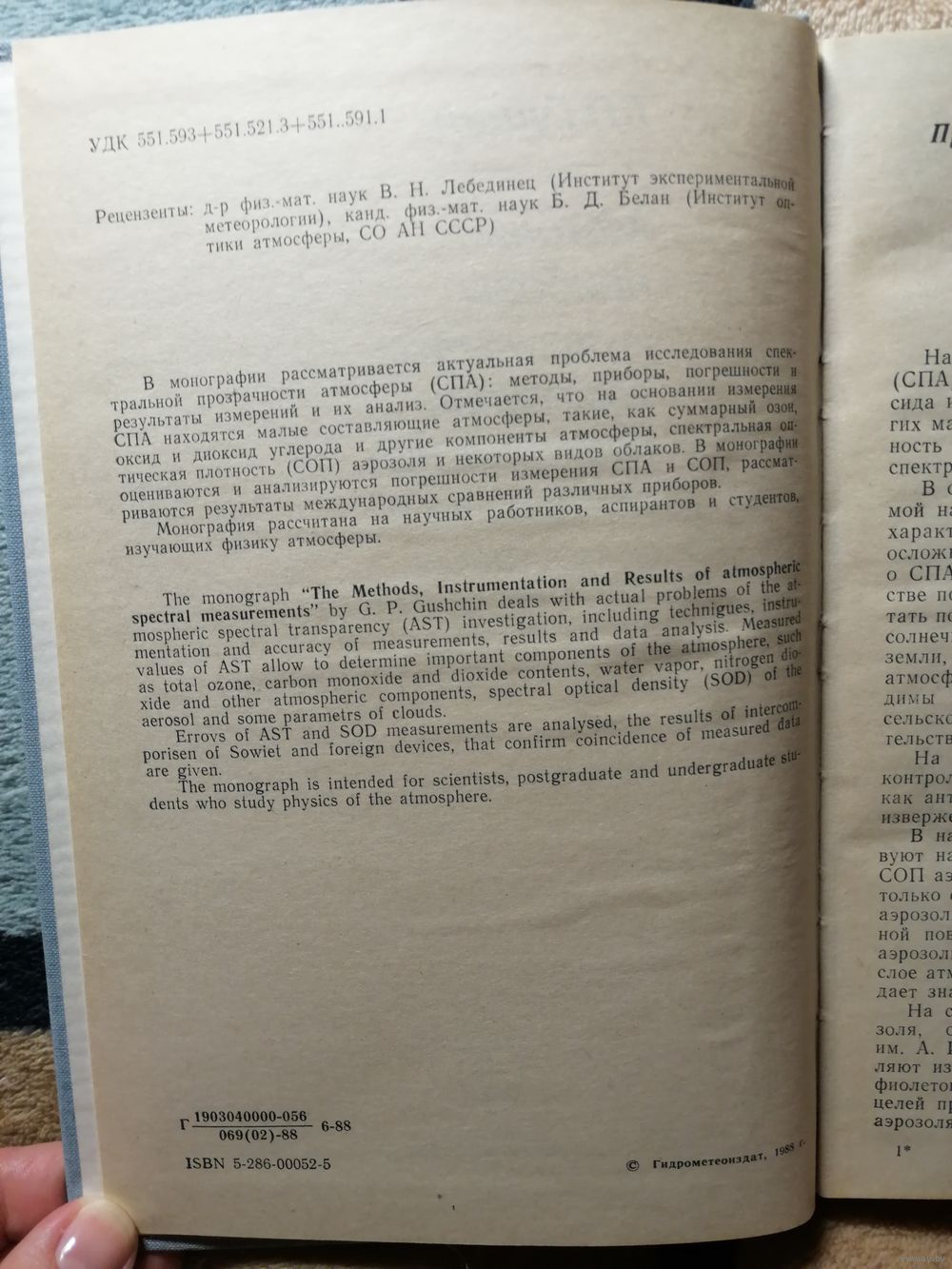 В монографии рассматривается актуальная проблема исследования спектральной прозрачности атмосферы (СПА): методы, приборы, погрешности и результаты измерений и их анализ. Отмечается, что на основании измерения СПА находятся малые составляющие атмосферы, такие, как суммарный озон, оксид и диоксид углерода и другие компоненты атмосферы, спектральная оптическая плотность (СОП) аэрозоля и некоторых видов облаков. В монографии оцениваются и анализируются погрешности измерения СПА и СОП, рассматриваются результаты международных сравнений различных приборов. Монография рассчитана на научных работников, аспирантов и студентов, изучающих физику атмосферы.