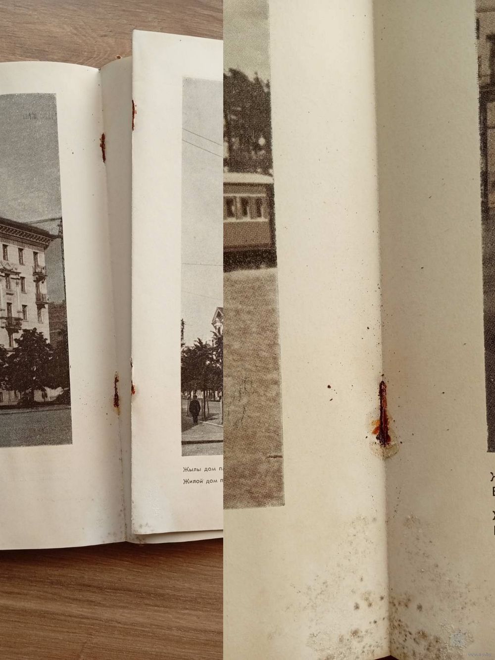 Лежала в подвале, поэтому такое состояние (засохшие потёки воды, плесень на этих местах, запах старой книги). Один блок листов на скобах выпал, ещё один держится на одной скобе, остальные на месте.