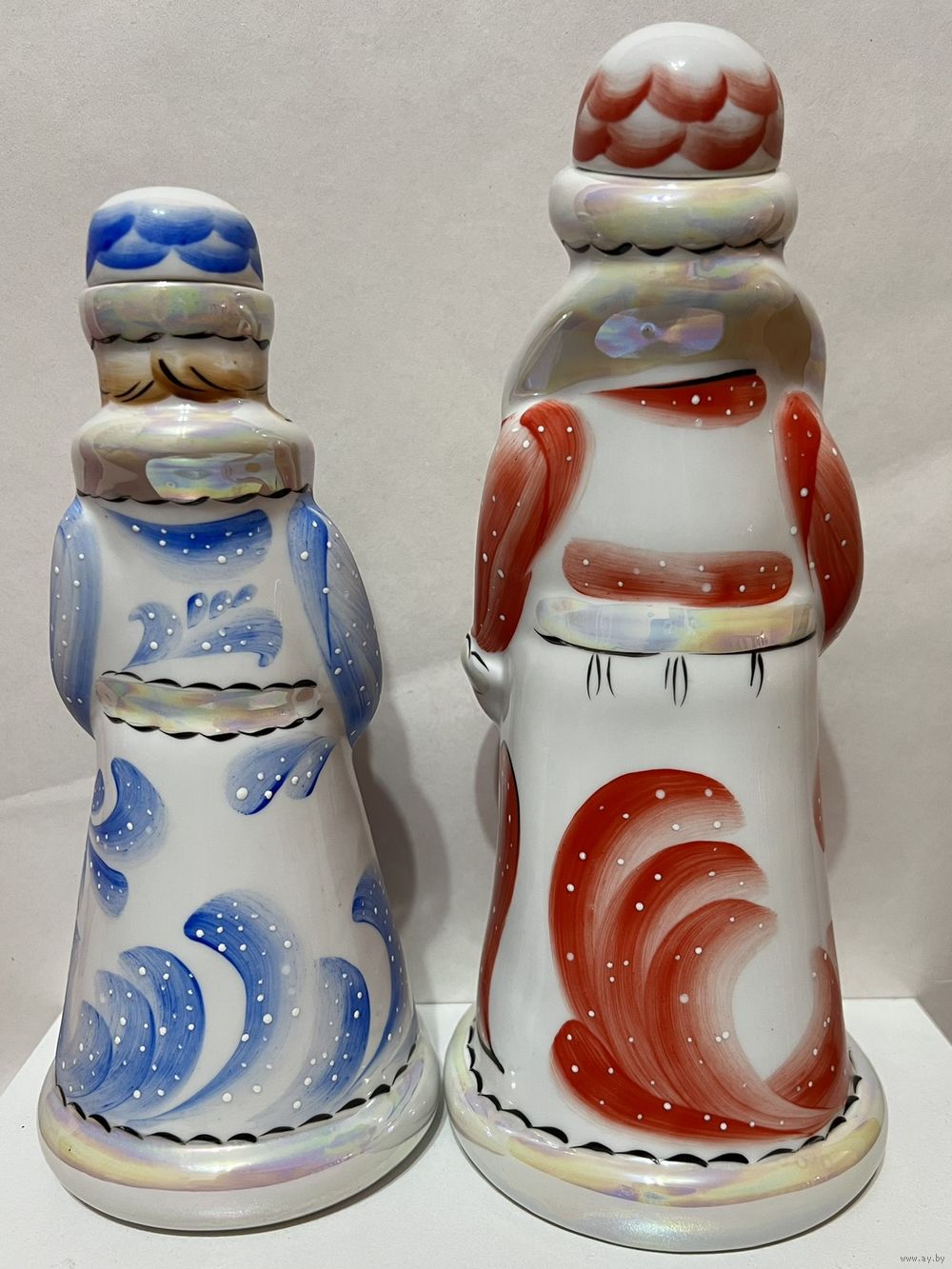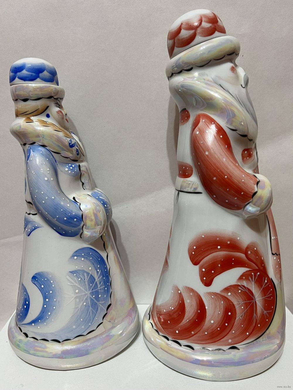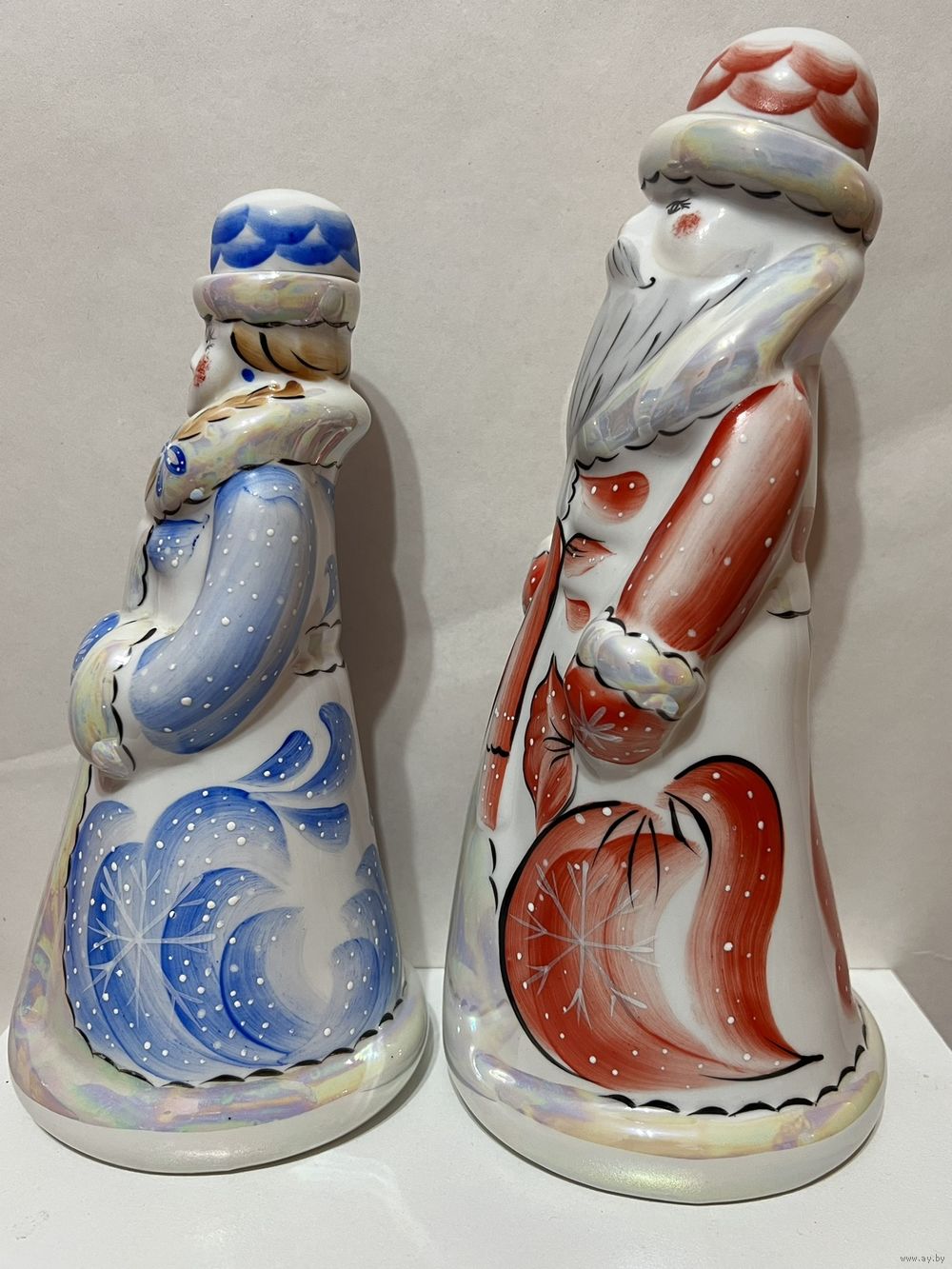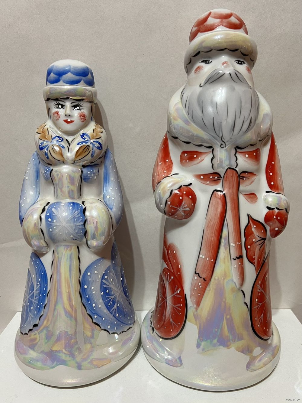 Фарфоровые "Дед Мороз и Снегурочка", высота 24,5 см и 21 см, производство Добрушский Фарфоровый Завод (ДФЗ). Продавец не является экспертом, состояние лотов всегда оценивайте самостоятельно, по представленным фотографиям, после выигрышной ставки вы получите предмет, изображенный на фотографии. Делая ставку вы принимаете условия продажи лота, установленные продавцом. Пересылку оплачивает покупатель. Выход на связь в течение 3 дней. Оплата лотов в течение 5 дней. Отправка лотов в течение 5 дней после оплаты и предварительной договорённости.