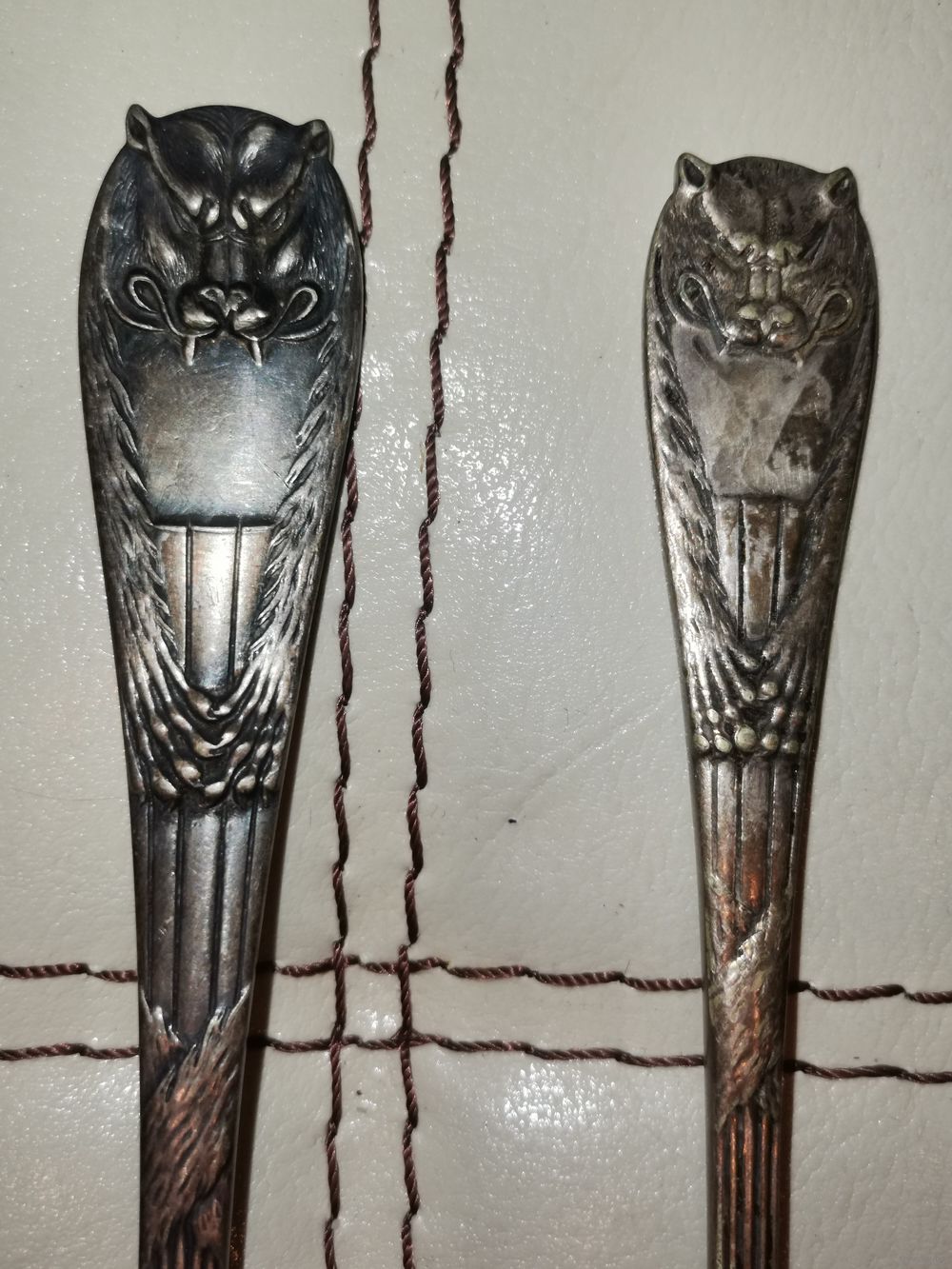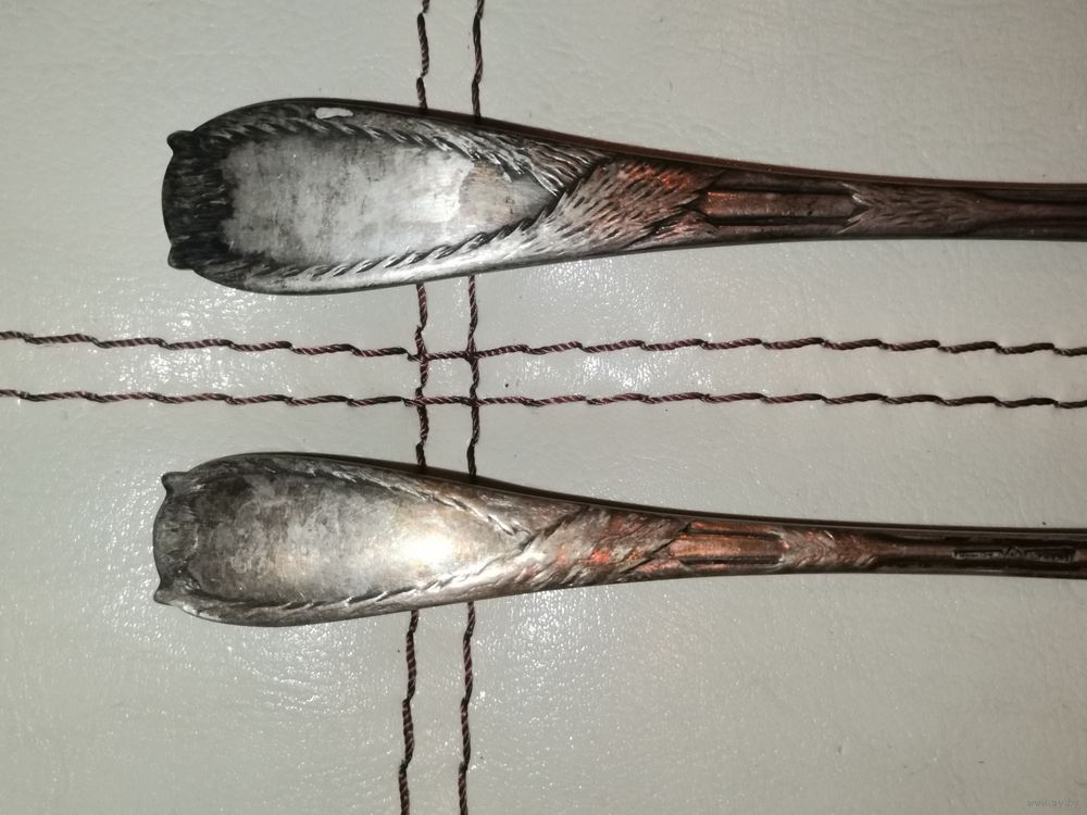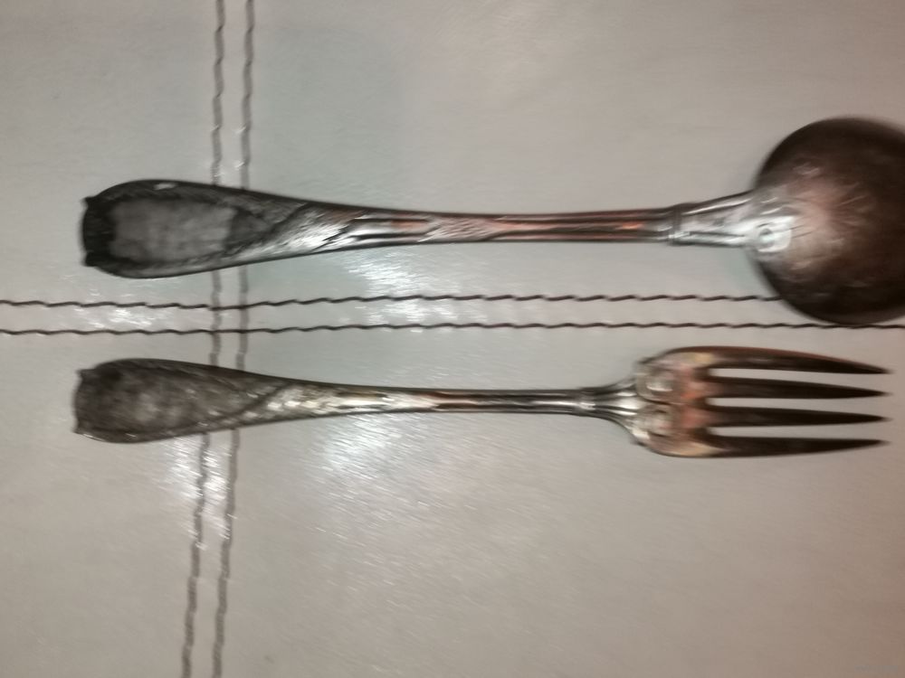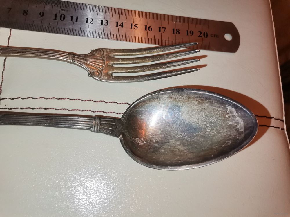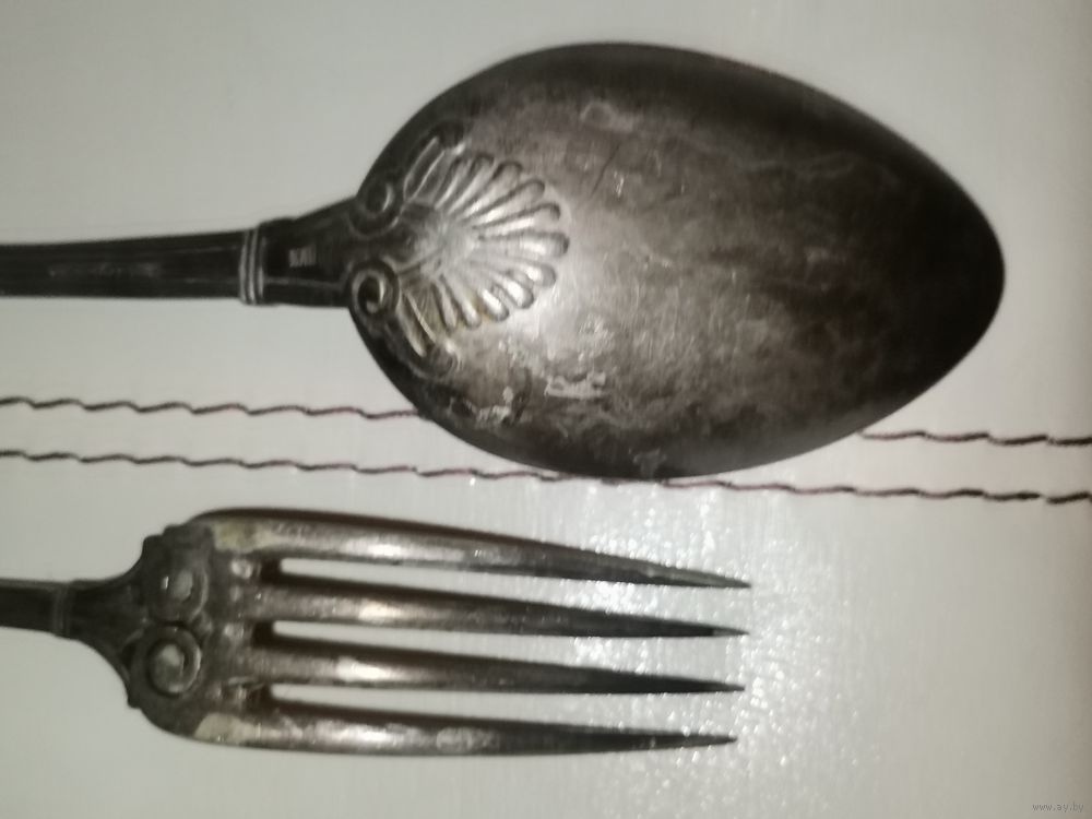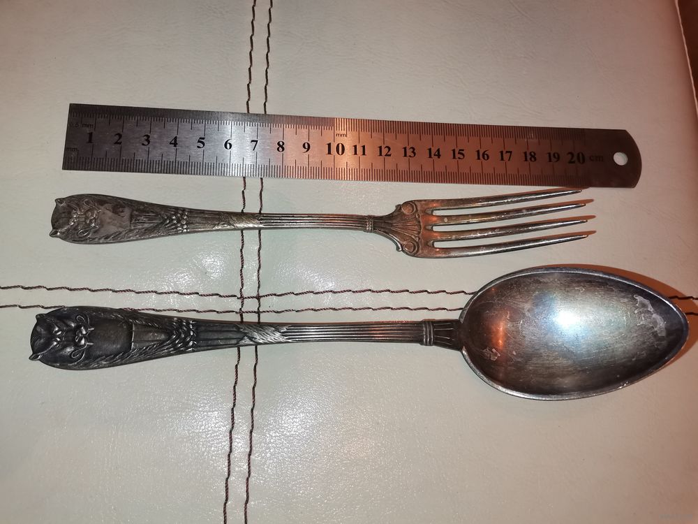 | Латунь в посеребрении. Ложка в хорошем состоянии, вилка имеет потёртости покрытия. | |