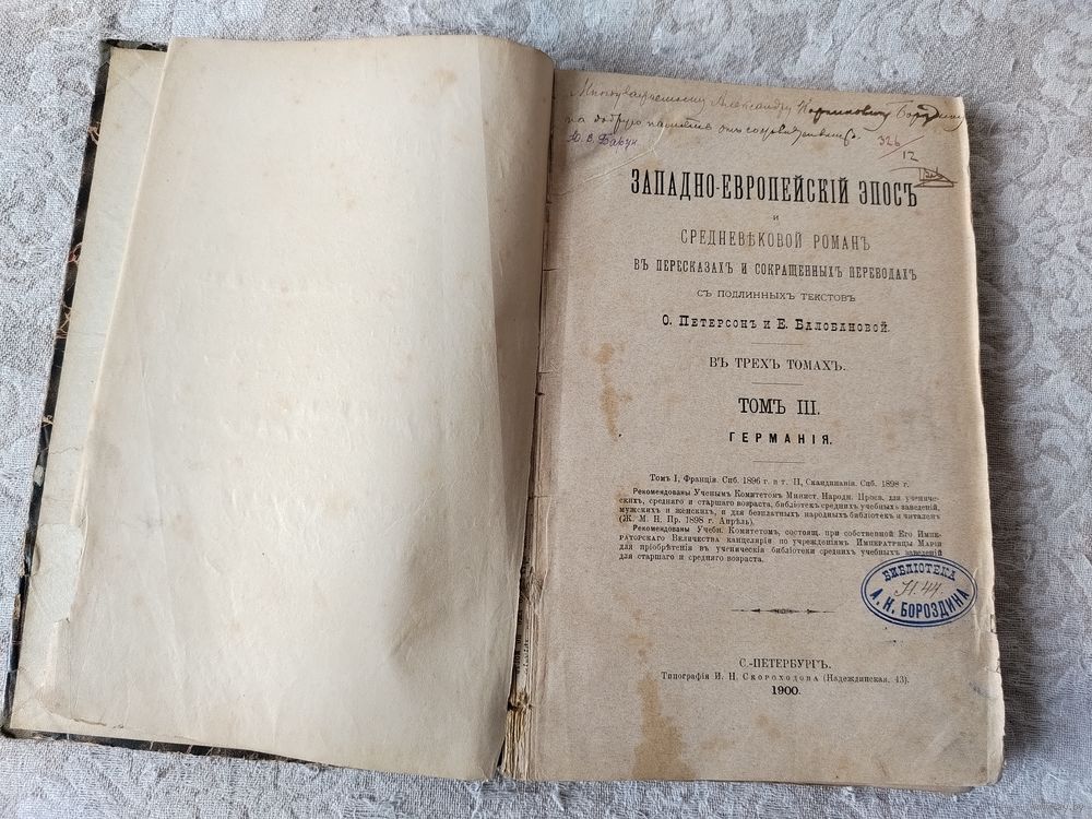 Книга из личной библиотеки Алекса́ндра Корни́лиевича Борозди́на (23 марта (4 апреля) 1863, Санкт-Петербург — 6 октября 1918, Петроград) — русский литературовед и историк литературы, масон, мемуарист.