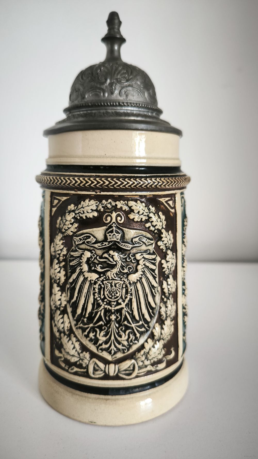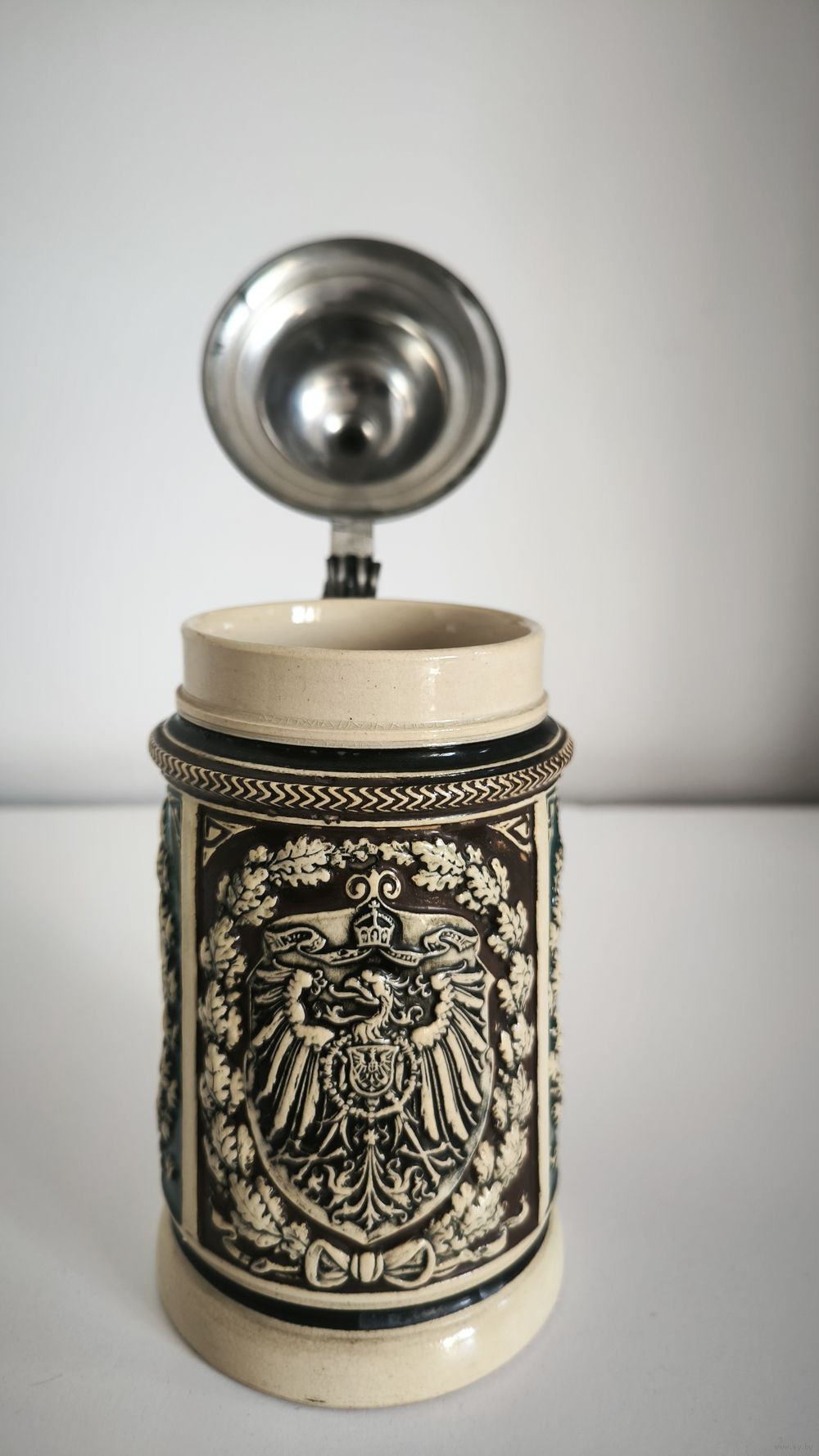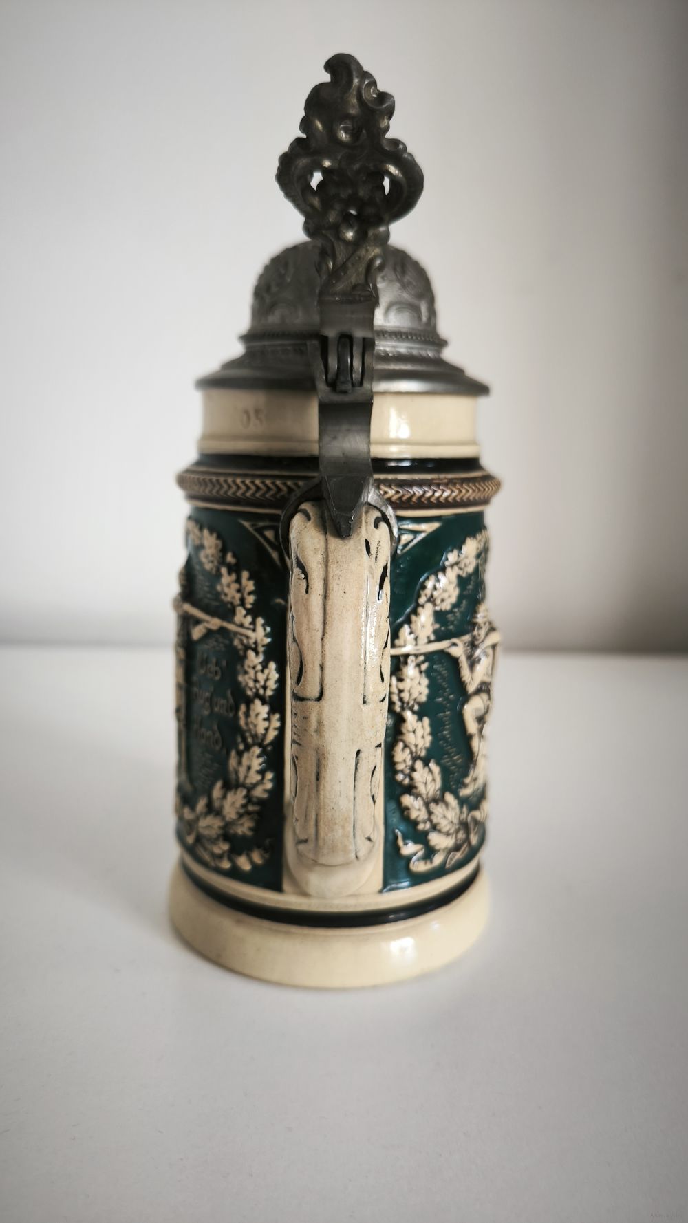 Кружка выполнена в традиционном немецком стиле с тремя основными художественными панелями, обрамленными дубовыми листьями (символ германской силы и верности):