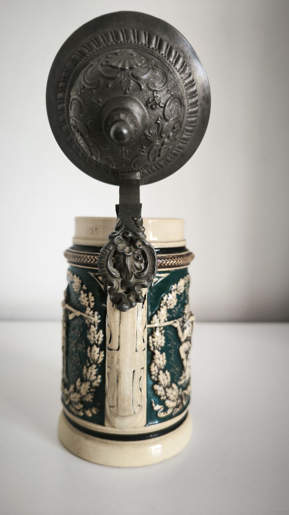 Полная фраза на кружке: «Ueb’ Aug’ und Hand für’s Vaterland» — популярный девиз немецких стрелковых клубов и союзов того времени.