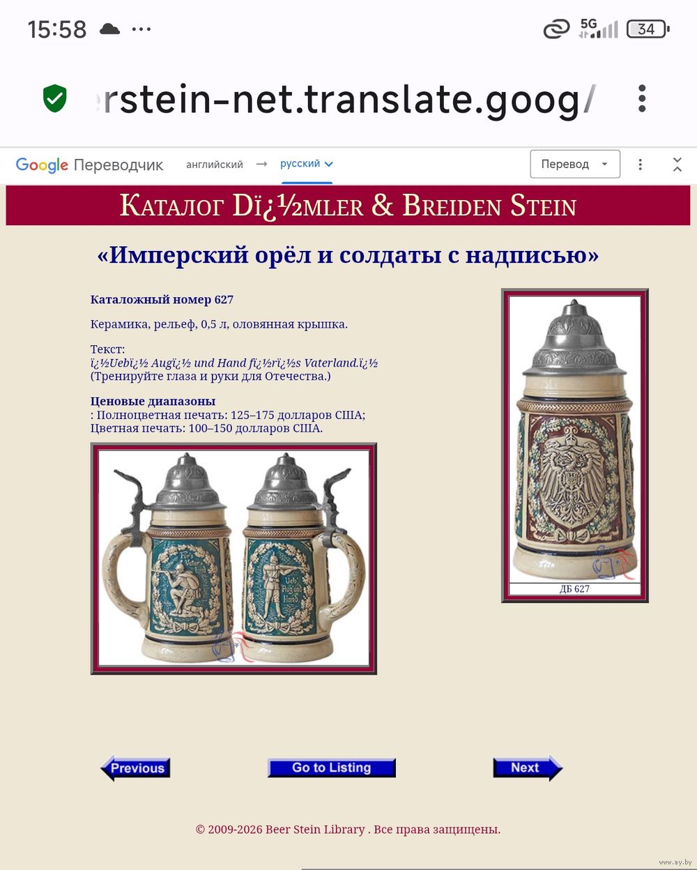 Фирма Dumler & Breiden была основана в 1883 году в городе Хёр-Гренцхаузен и являлась одним из ведущих производителей художественной керамики в Германии. Данная модель (№ 627) представляет собой классический образец «патриотического штайна», который часто вручался как приз на стрелковых соревнованиях или использовался ветеранами.