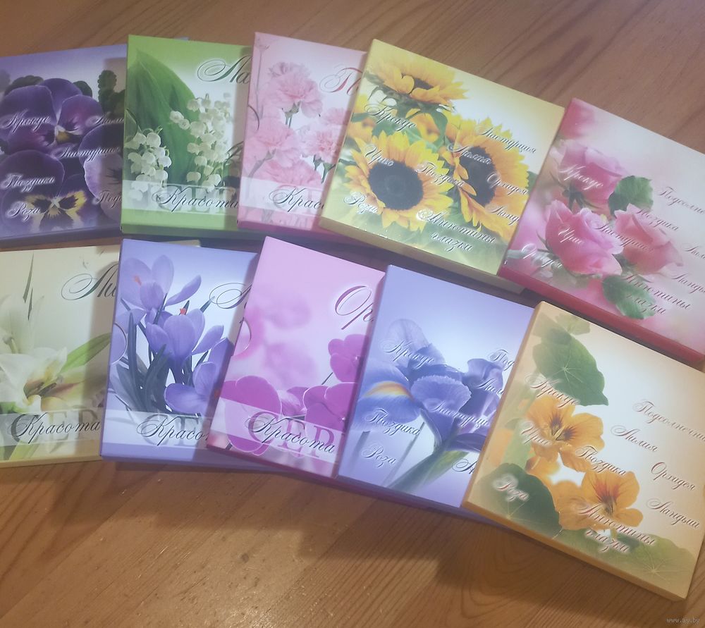 В состав комплекта входят десять памятных монет: "Роза (Rosa)", "Орхидея (Orchidaceae)", "Лилия (Lilium)", "Гвоздика (Dianthus)", "Ирис (Iris)", "Настурция (Tropaeolum)", "Подсолнечник (Helianthus)", "Крокус (Crocus)", "Ландыш (Convallaria)", "Анютины глазки (Viola)"