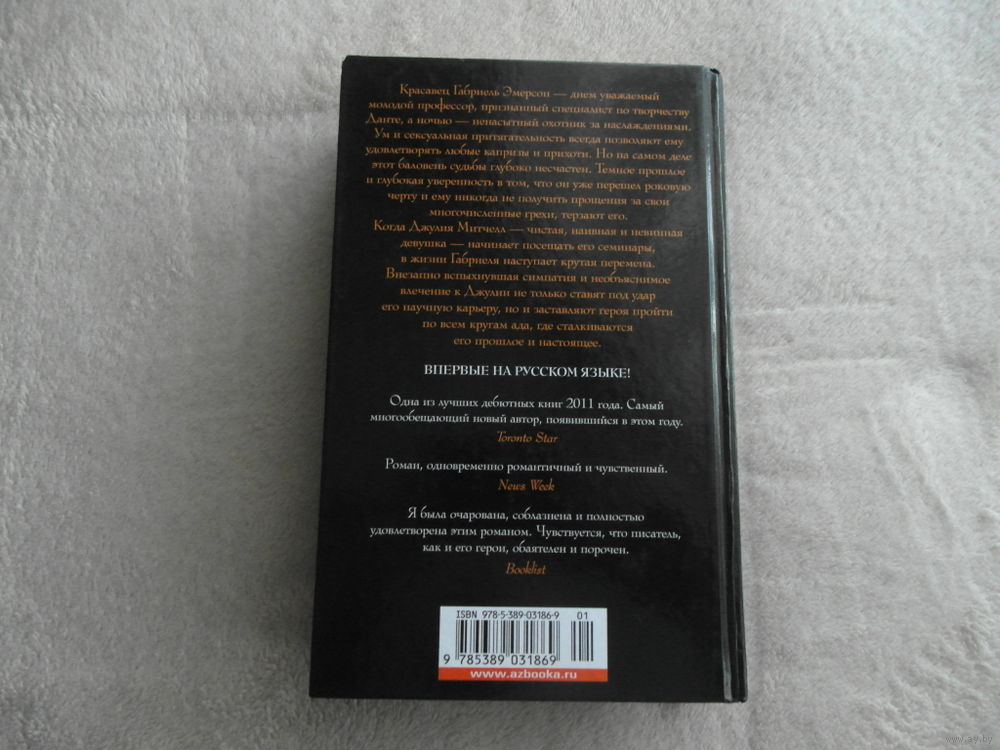 Захватывающее повествование о спасении мужской души и пробуждении женской чувственности… Красавец Габриель Эмерсон — днем уважаемый молодой профессор, признанный специалист по творчеству Данте, а ночью — ненасытный охотник за наслаждениями. Ум и сексуальная притягательность всегда позволяют ему удовлетворять любые капризы и прихоти. Но на самом деле этот баловень судьбы глубоко несчастен. Темное прошлое и глубокая уверенность в том, что он уже перешел роковую черту и ему никогда не получить прощения за свои многочисленные грехи, терзают его. Когда Джулия Митчелл — чистая, наивная и невинная девушка — начинает посещать его семинары, в жизни Габриеля наступает крутая перемена. Внезапно вспыхнувшая симпатия и необъяснимое влечение к Джулии не только ставят под удар его научную карьеру, но и заставляют героя пройти по всем кругам ада, где сталкиваются его прошлое и настоящее.