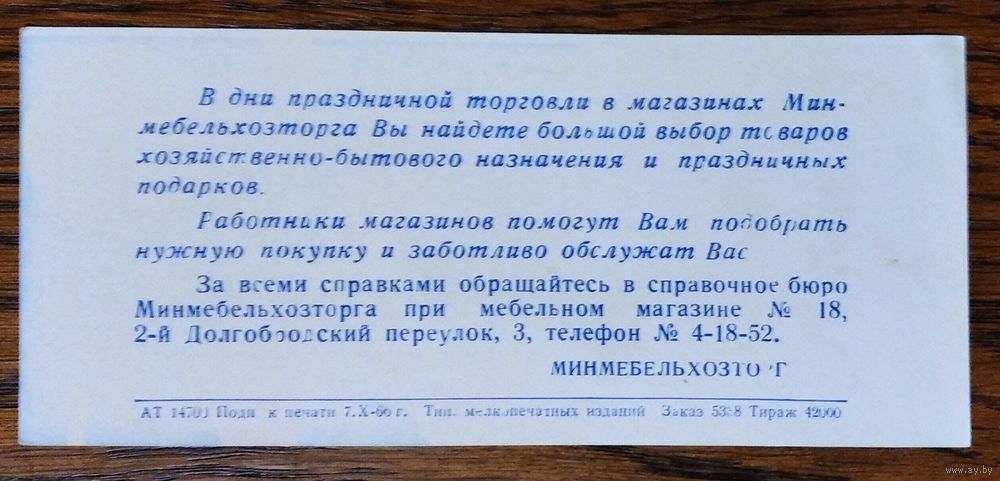 Рекламка Минмебельхозторга " С праздником Октября " 1966 г.