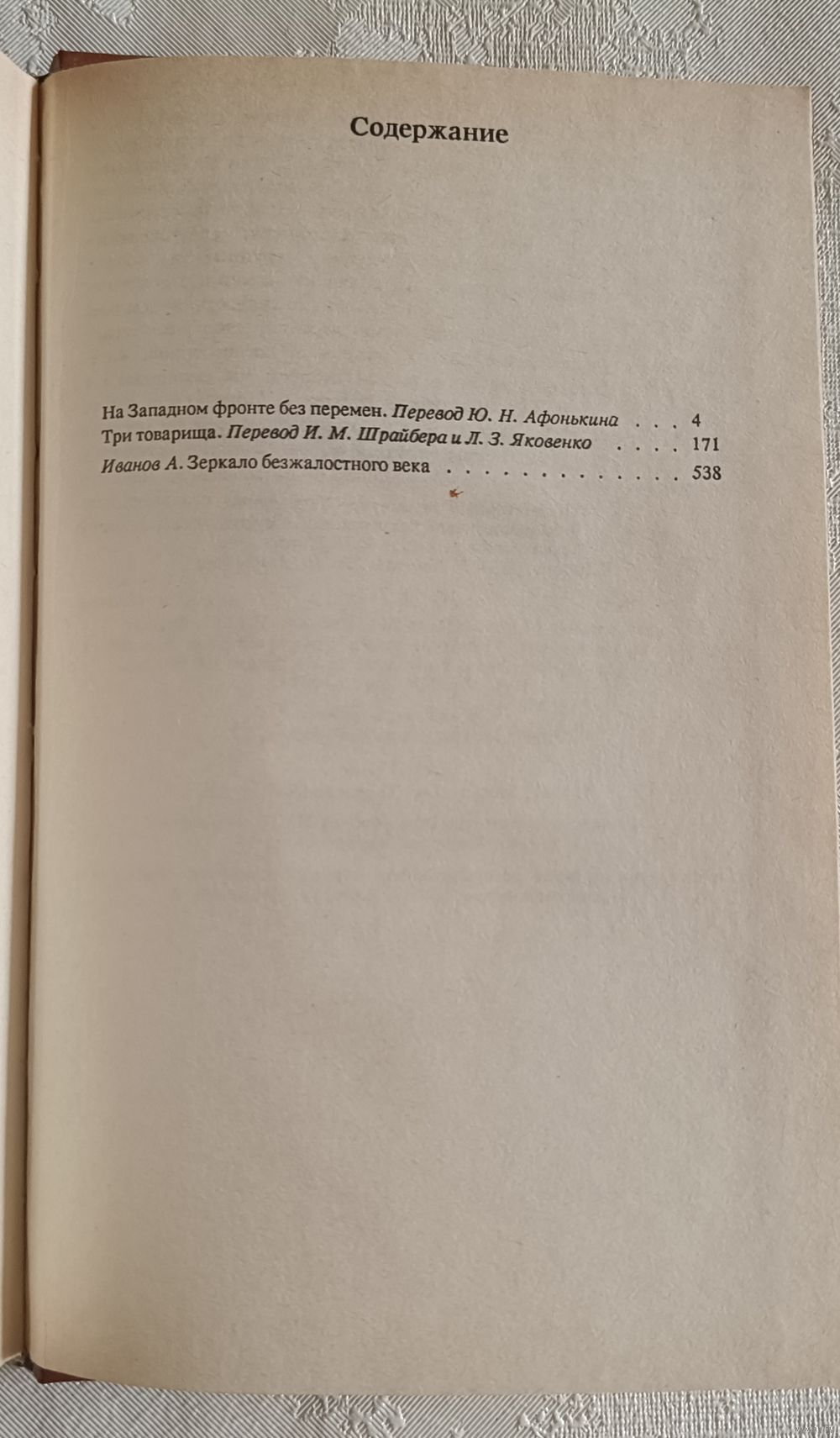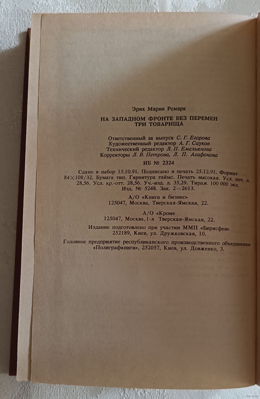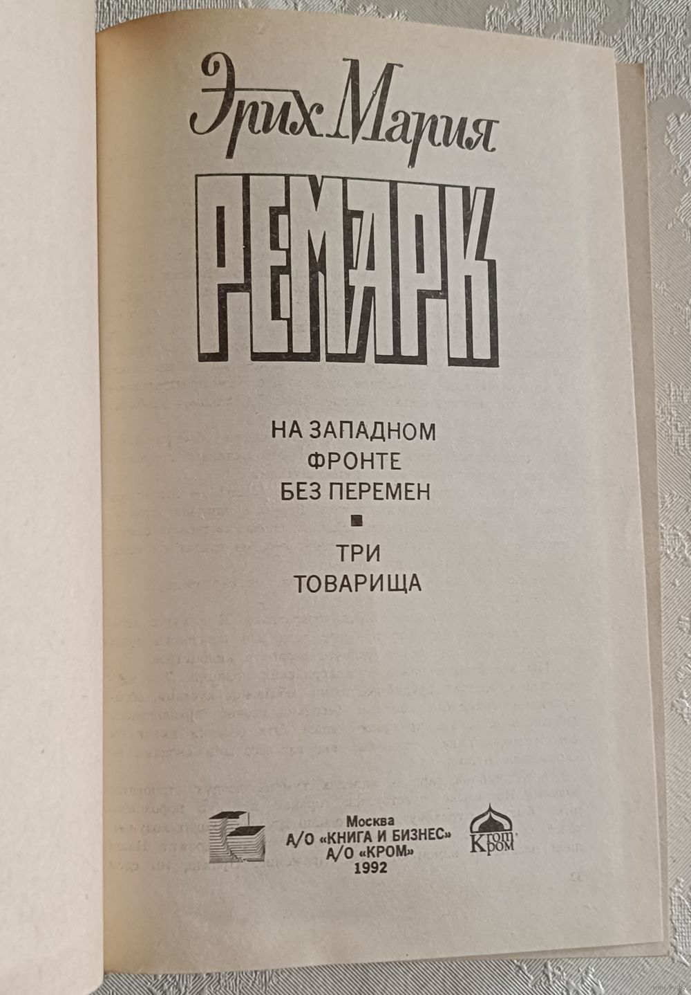 Ремарк Эрих Мария. На западном фронте без перемен. Три товарища. А/О"КНИГА И БИЗНЕС" А/О"КРОМ" совместное предприятие LEXICA, Москва, 1992, стр. 544, твердый переплет, обычный формат.