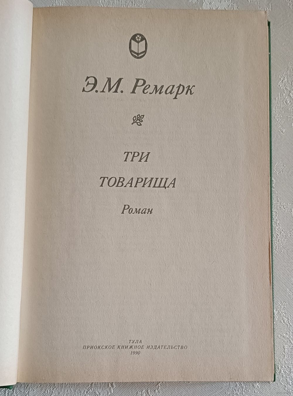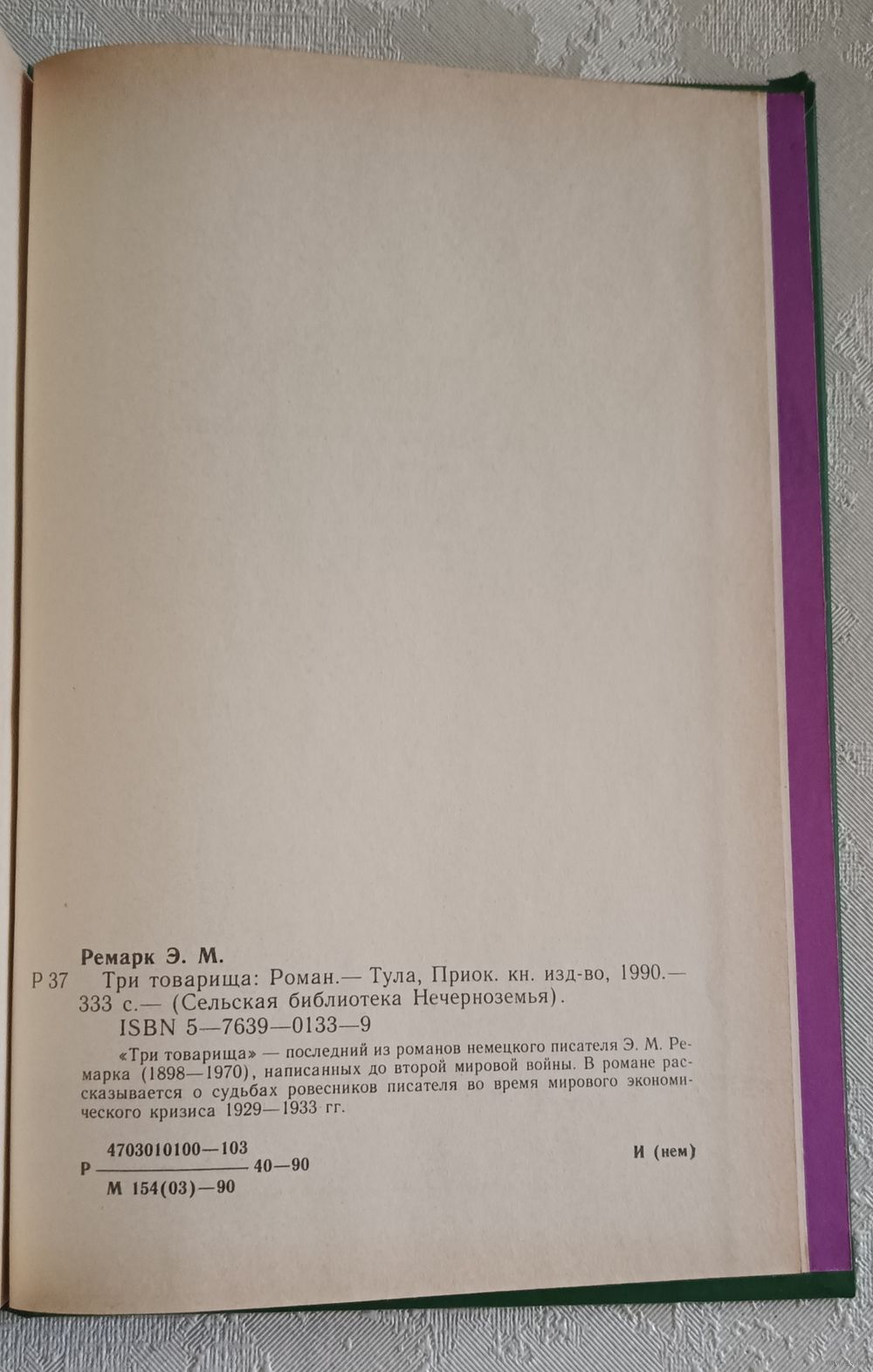Ремарк Эрих Мария. Три товарища: Роман. Тула, Приок. кн. изд-во, 1990. -333 с. (Сельская библиотека Нечерноземья), твердый переплет, чуть увеличенный формат.