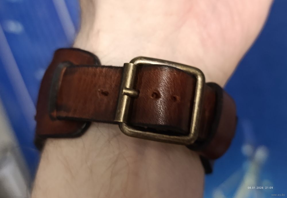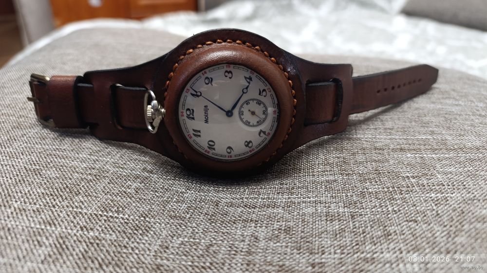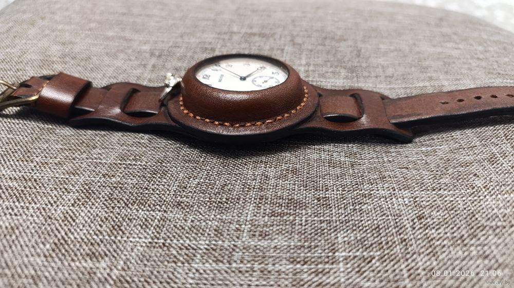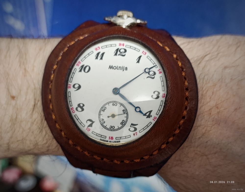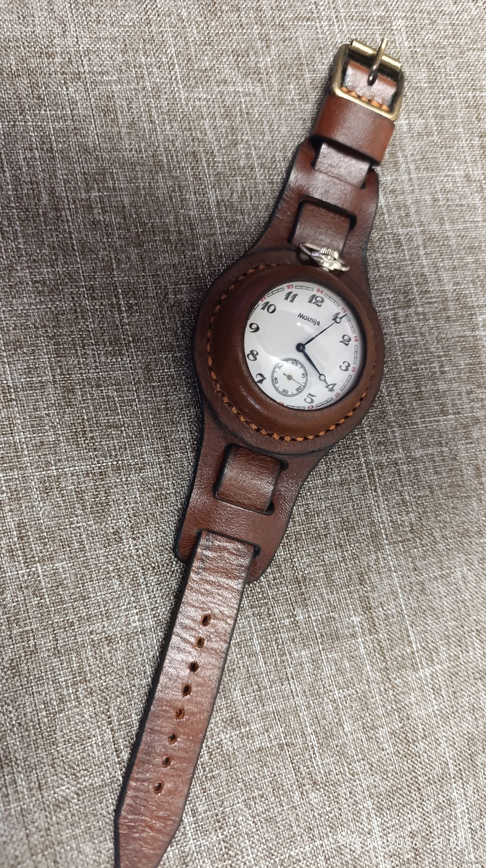 Ремешок изготовлен из натуральной кожи для карманных часов Молния ,диаметром 50 мм. Ремешок пошит для крупного запястья (обхват 20-24см). Длинна самого ремешка 27 см.