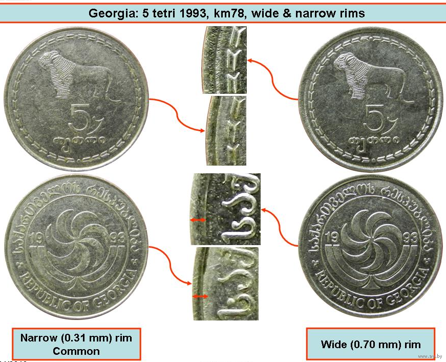 РЕСПУБЛИКА ГРУЗИЯ 5 ТЕТРИ 199З. UNC. ЛЕВ. Вариант: узкий кант.