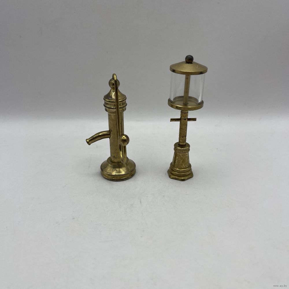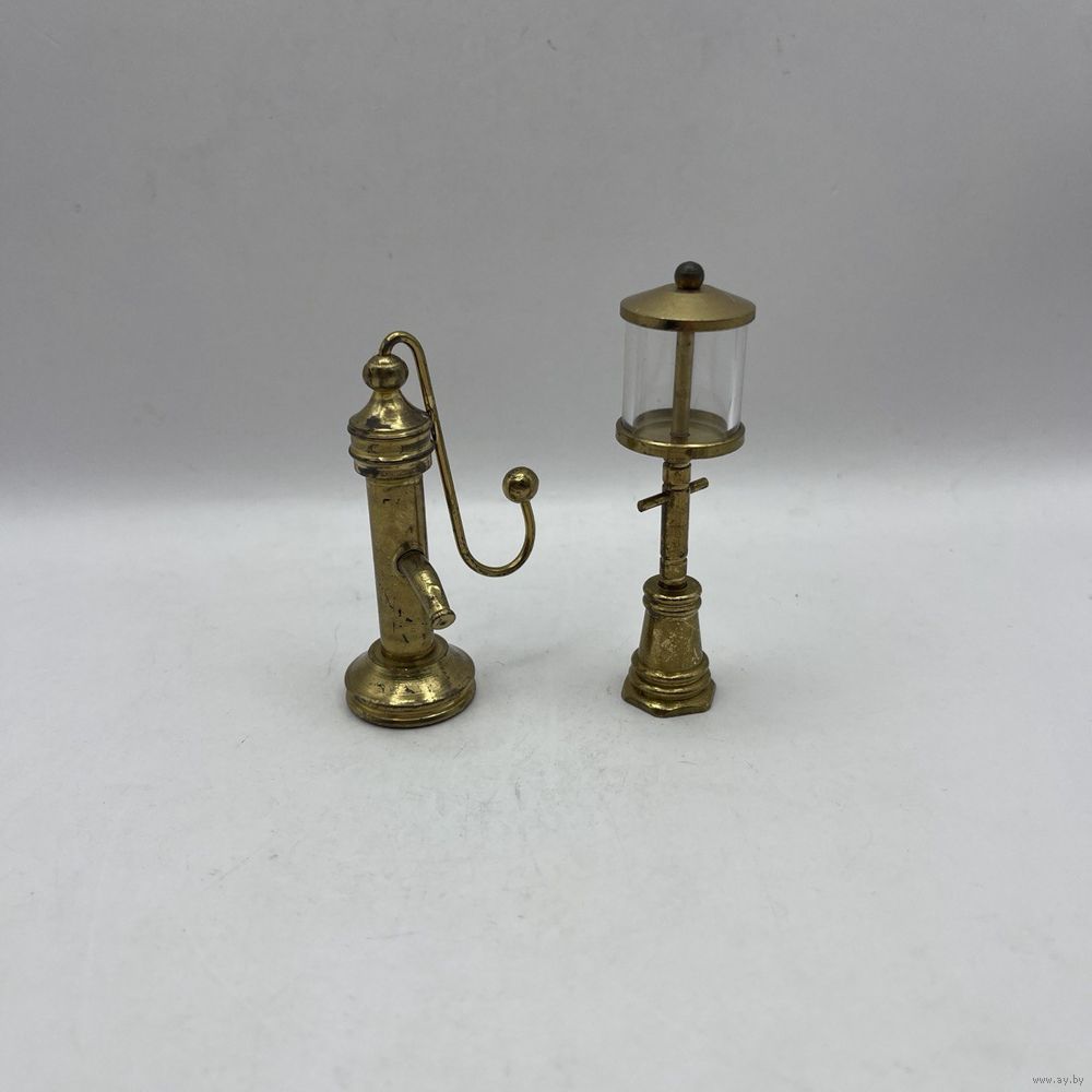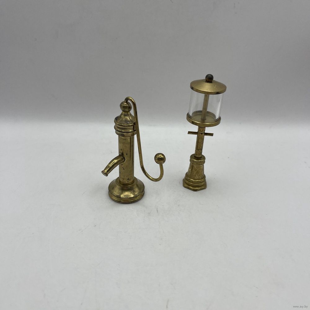 Винтажные латунные ретро-миниатюры Старый город, изящный уличный фонарь со стеклянным плафоном и уличная водяная колонка с изогнутой рукоятью. Франция. 1950-е г.г. Высота фонаря 7,5 см, диаметр 2 см. Высота колонки 7 см, ширина по ручке 4 см. Естественная патина.