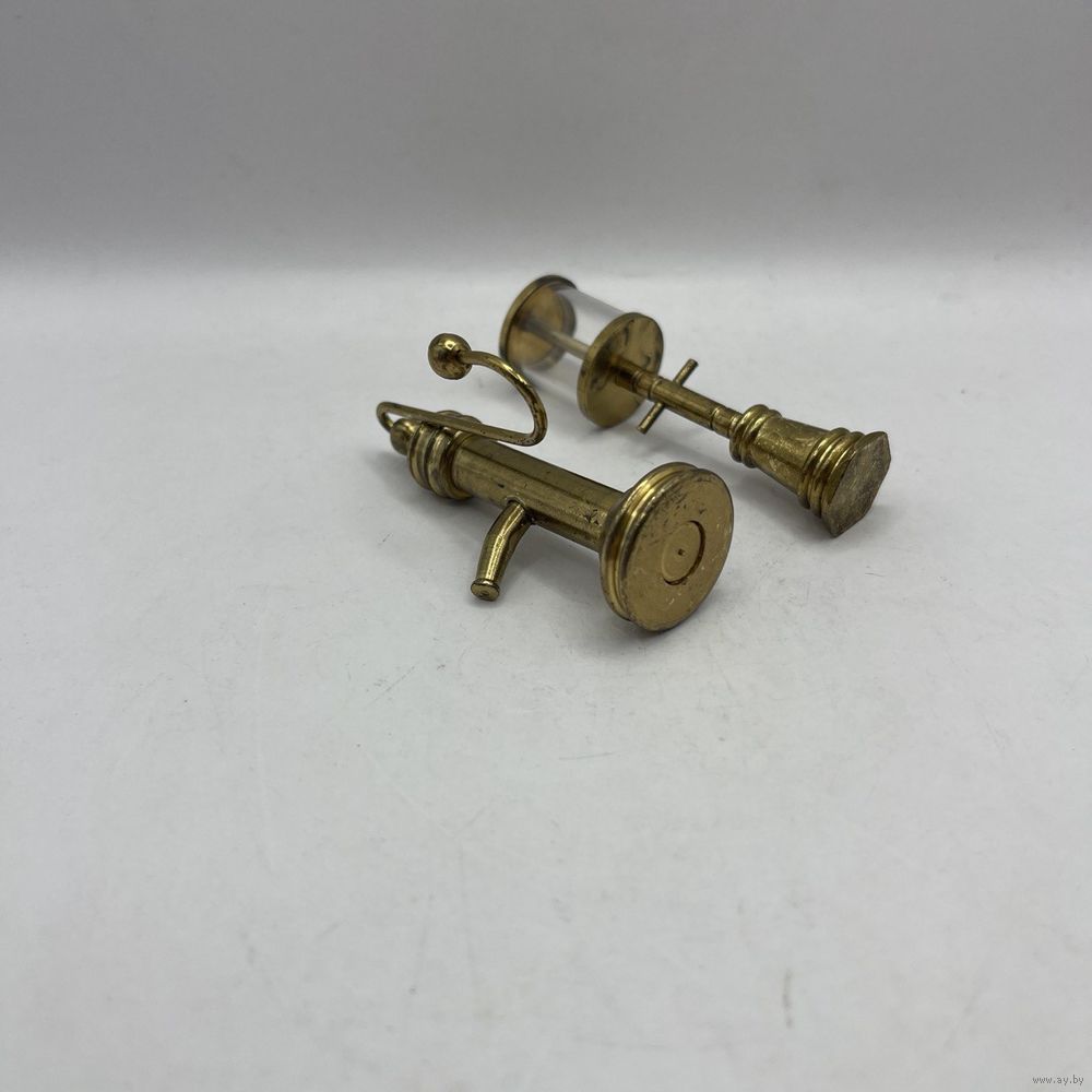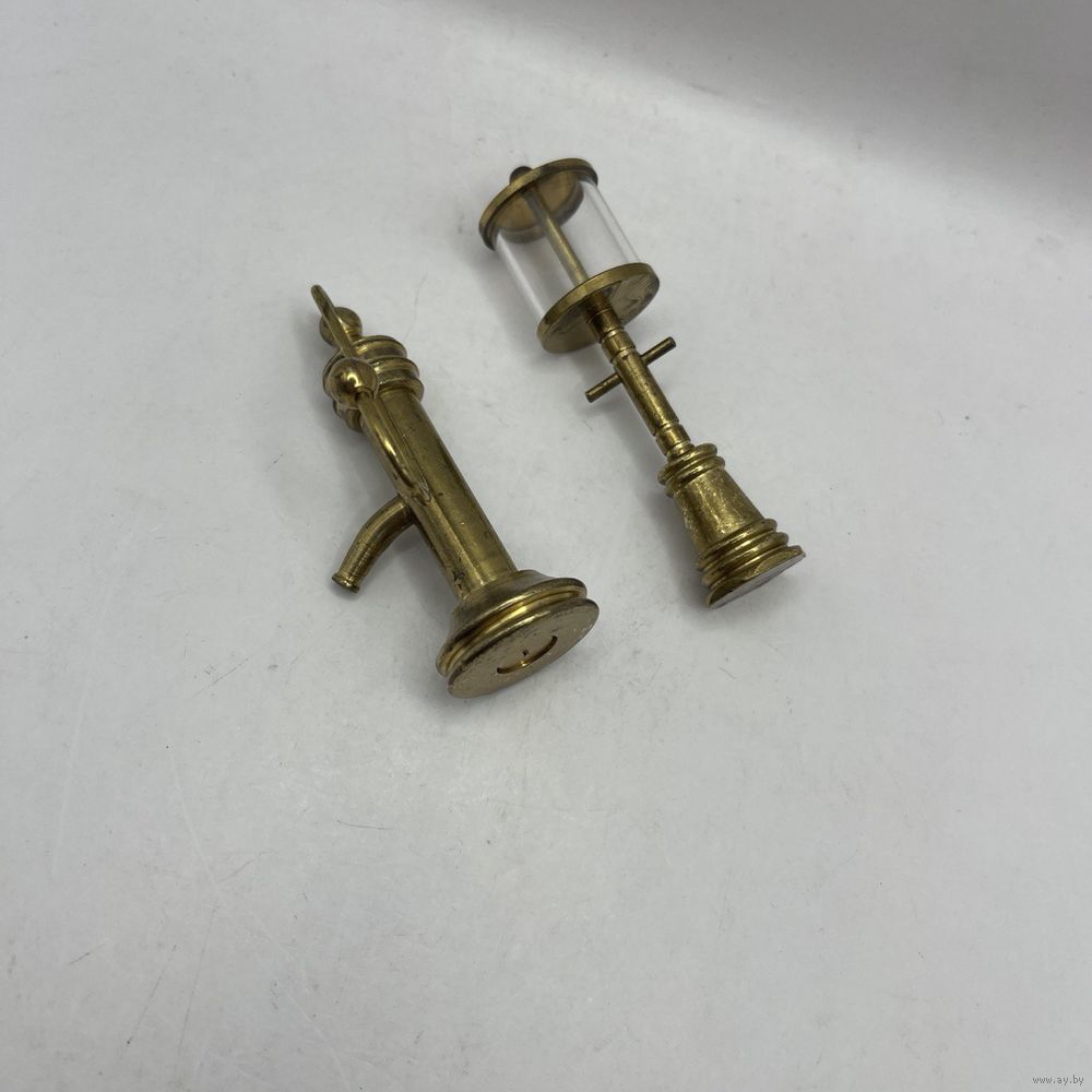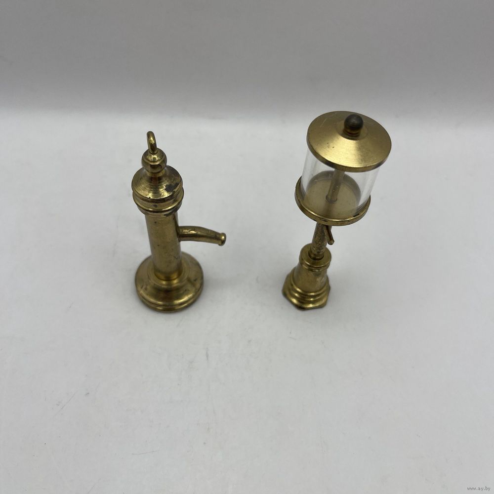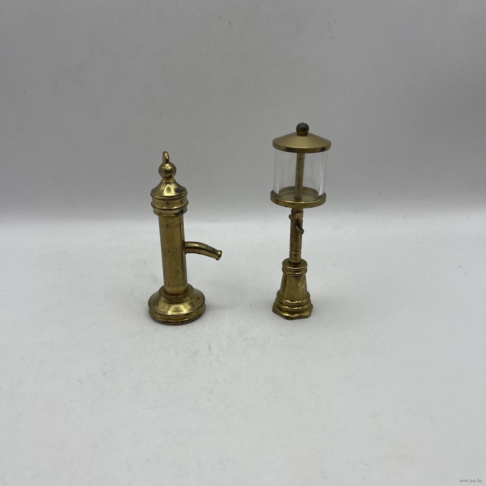 Винтажные латунные ретро-миниатюры Старый город, изящный уличный фонарь со стеклянным плафоном и уличная водяная колонка с изогнутой рукоятью. Франция. 1950-е г.г. Высота фонаря 7,5 см, диаметр 2 см. Высота колонки 7 см, ширина по ручке 4 см. Естественная патина.