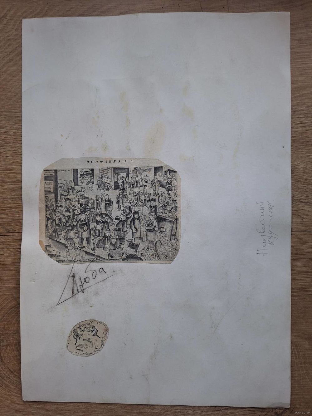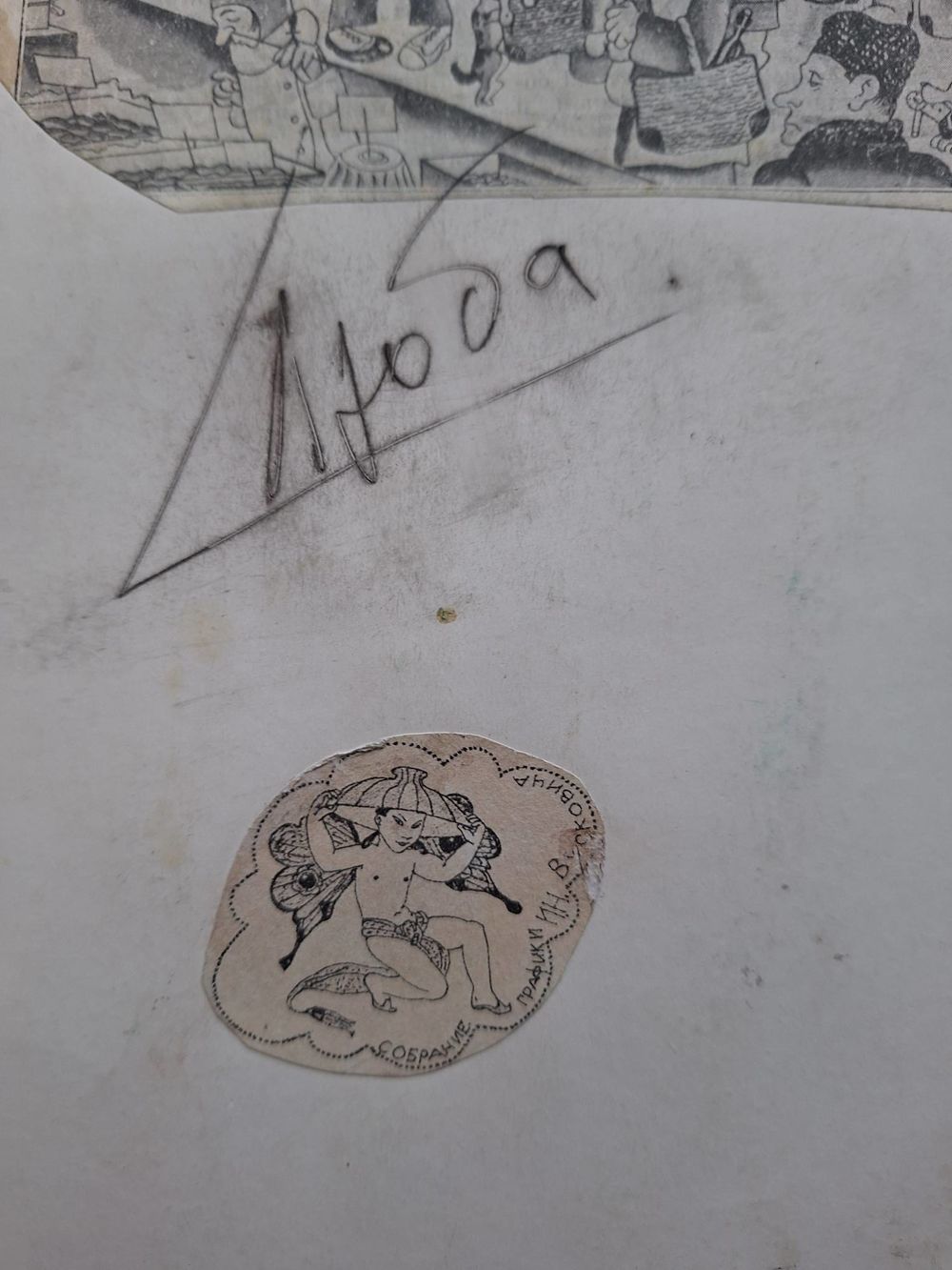Работа из частной коллекции графики Игоря Николаевича Вусковича 1904-1992 г. Художник-постановщик киностудии «Ленфильм», И.Н. Вускович, обладатель известной коллекции графики советских и зарубежных художников 19-20 го века. На обороте листа наклеен эксилибрис коллекционера и вырезка- карикатура. Надпись коллекционера? - Неизвестный художник.