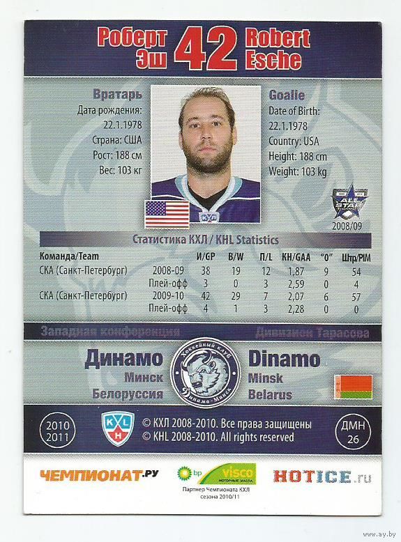 Роберт Эш / "Динамо" Минск / базовая вариация / Коллекция "SeReal Карточки КХЛ 2010-2011".