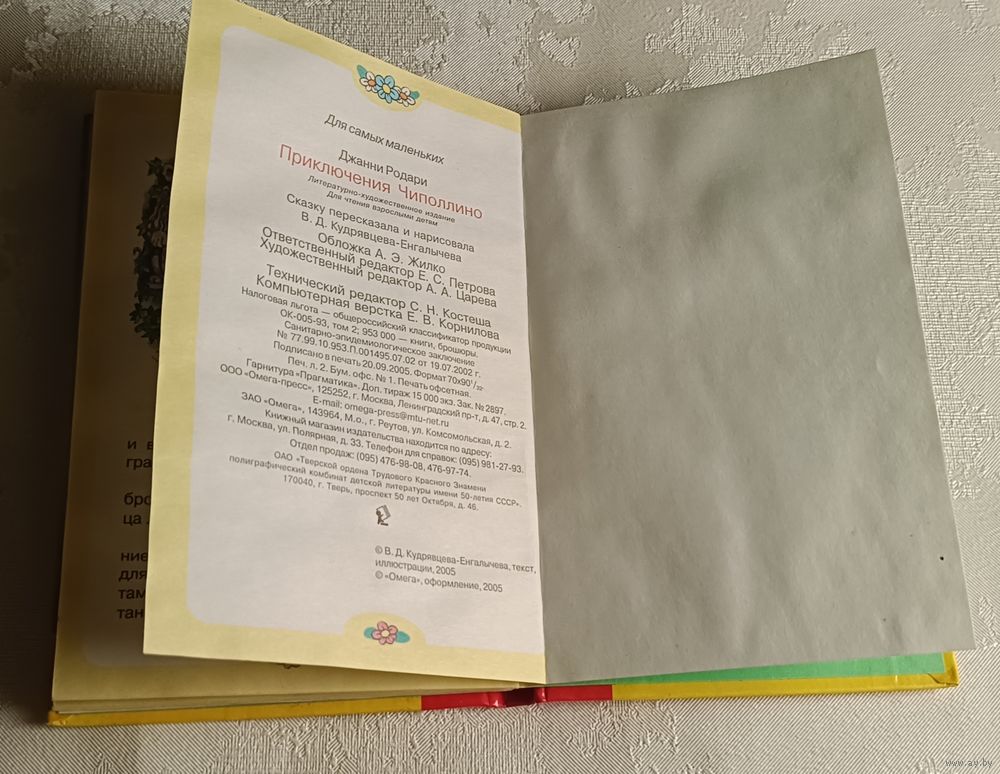 Родари Джанни. Приключения Чиполлино. Сказку пересказала и нарисовала В.Д. Кудрявцева-Енгалычева. М., Омега, 2005, стр. 64, твердый переплет, уменьшенный формат. (Серия для самых маленьких).