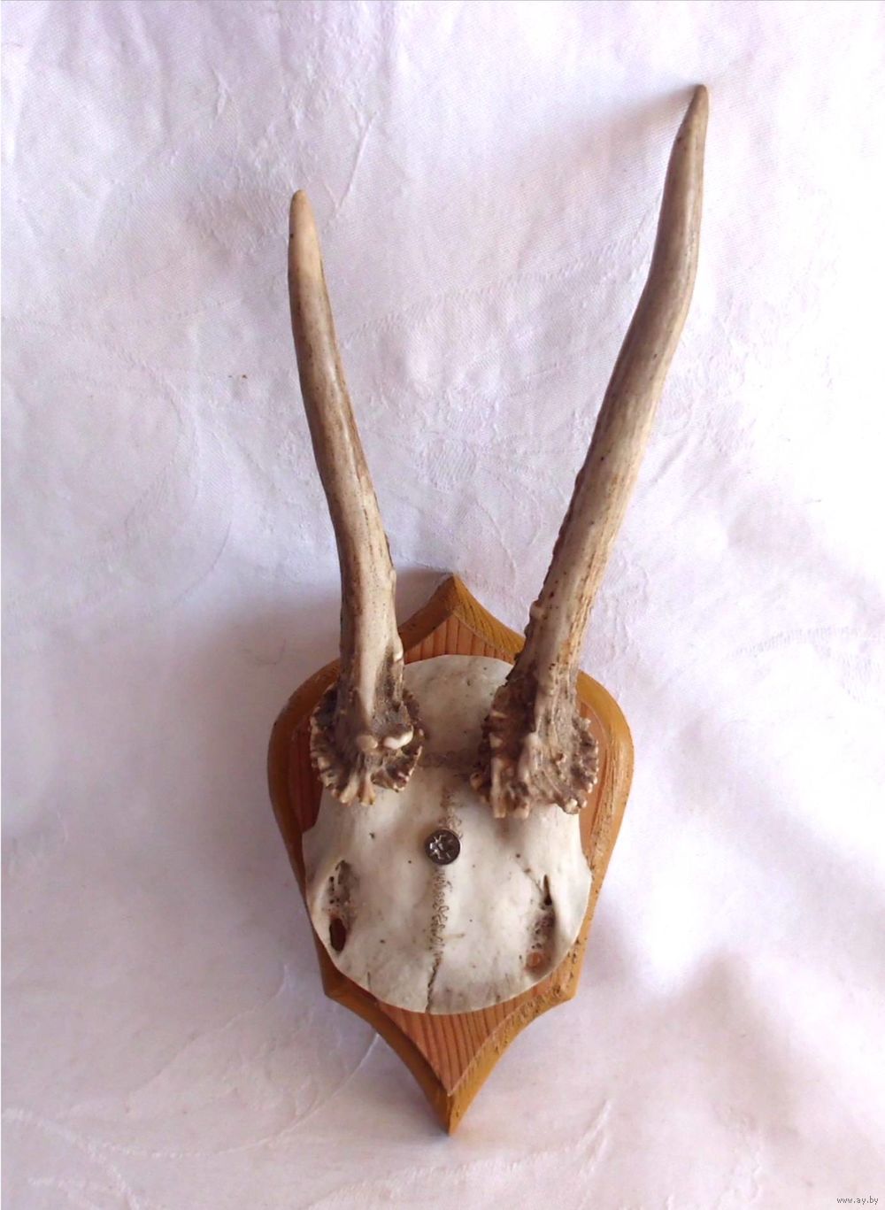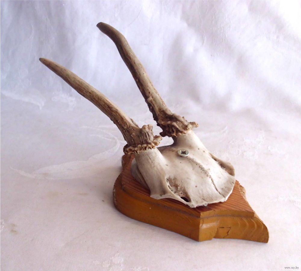 Рога косули европейской на деревянном медальоне.