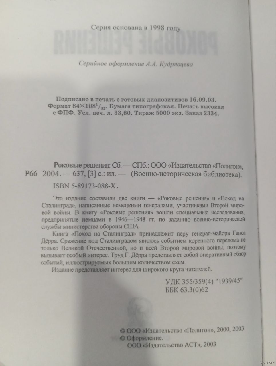 Сборник "Роковые решения. Поход на Сталинград" составили две книги, написанные немецкими генералами — участниками Второй мировой войны . В книгу "Роковые решения" вошли специальные исследования, предпринятые немцами в 1946-1948 гг. по заданию военно-исторической службы министерства обороны США . Книга "Поход на Сталинград" принадлежит перу генерал-майора Ганса Дёрра, которому пришлось пережить поражение 6-й армии . Издание 2004 года, издательство "Полигон" (Санкт-Петербург), серия "Военно-историческая библиотека" .