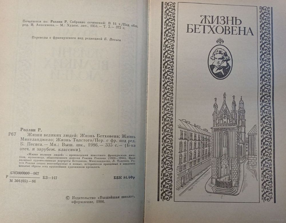 Роллан Ромен. Жизнь великих людей: Жизнь Бетховена; Жизнь Микеланджело; Жизнь Толстого. Мн.: Выш. шк., 1985. — 335 с. (Б-ка отеч. и зарубеж. классики).
