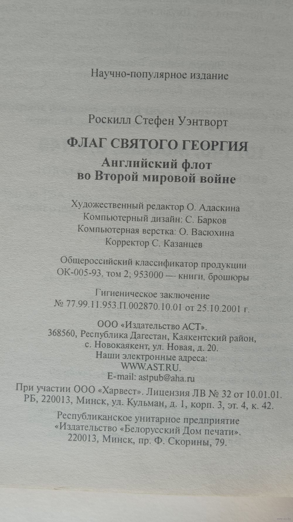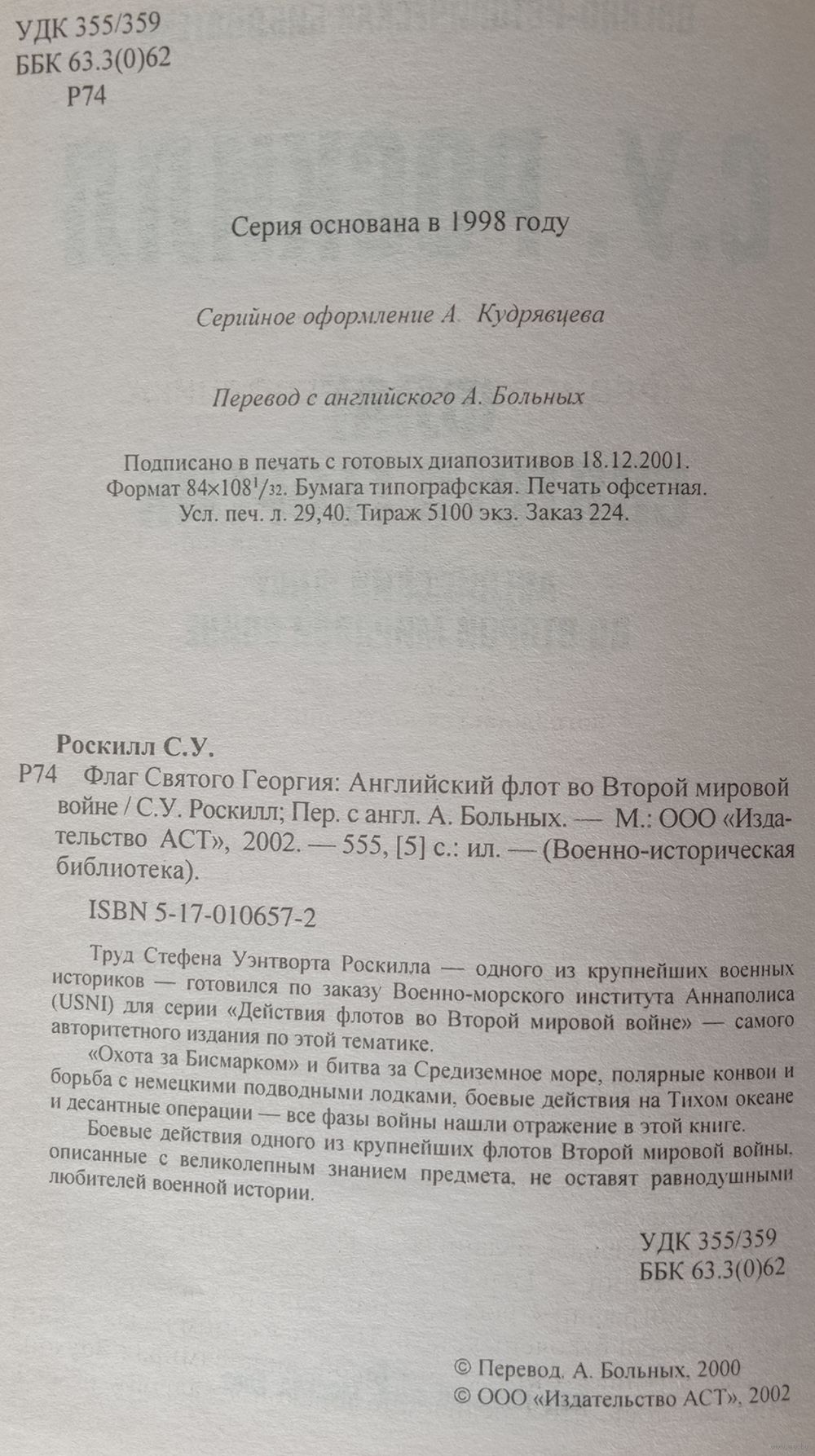 Роскилл. Флаг Святого Георгия. Английский флот во второй мировой войне. Изд. АСТ 2002г. 555 страниц. Тираж 5100экз. Серия Военно-историческая библиотека.