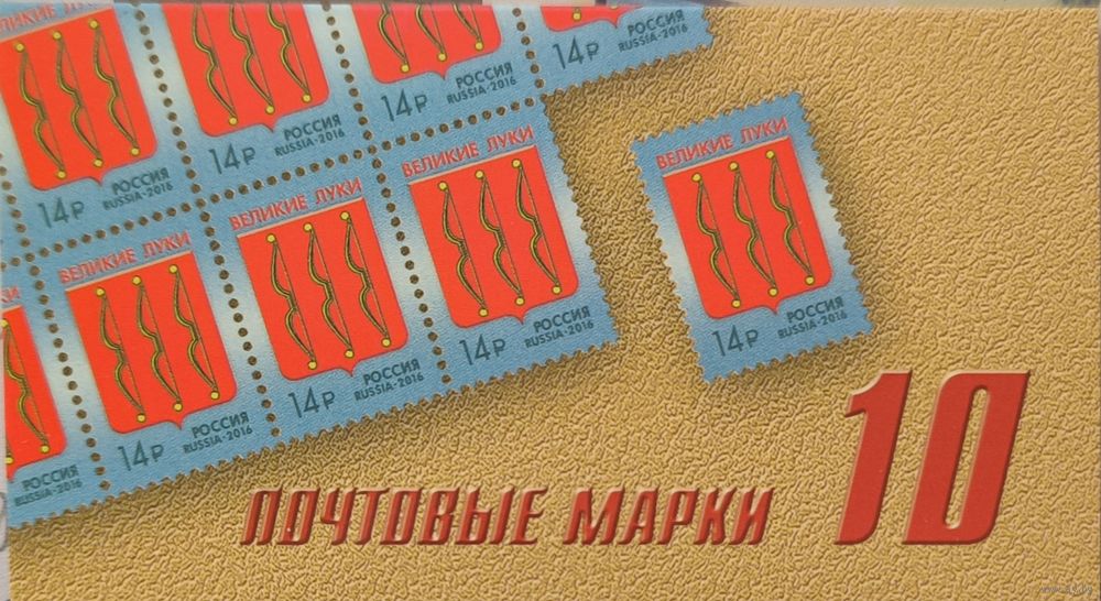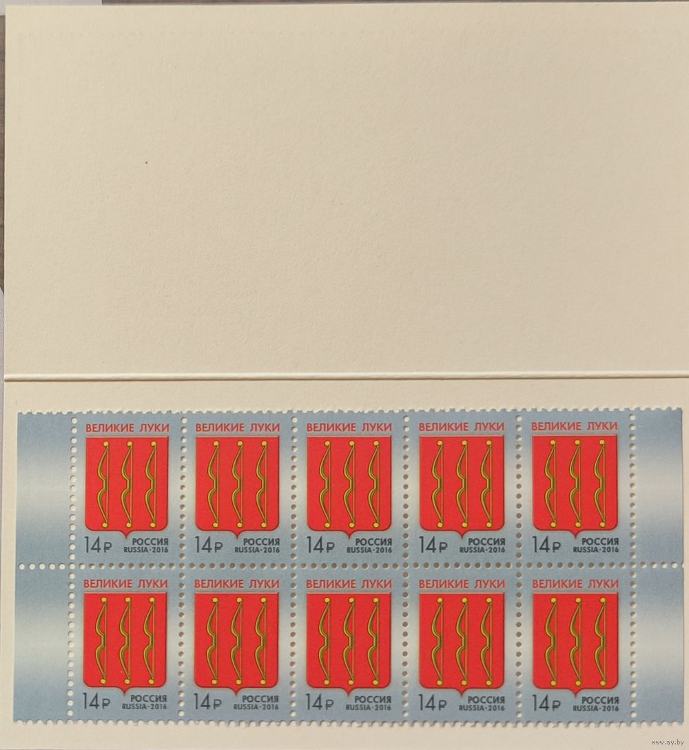 Российская Федерация. Герб города Великие Луки. Стандартный выпуск. Сувенирный набор № 2130 (сцепка из 10 марок) (Загорский).