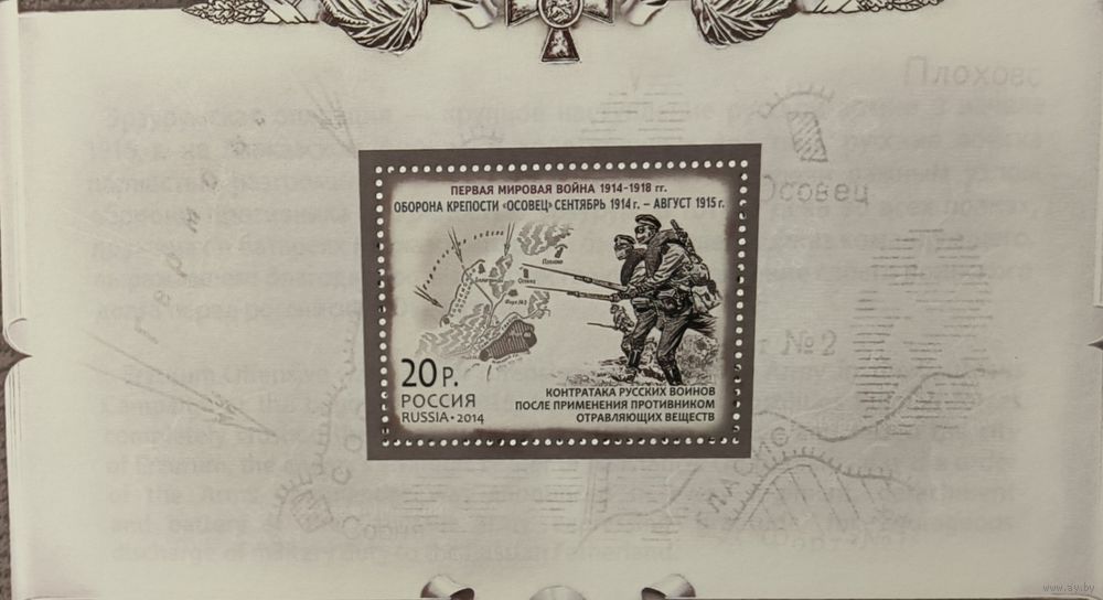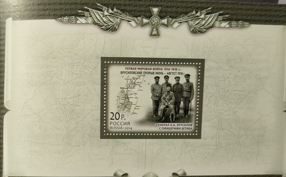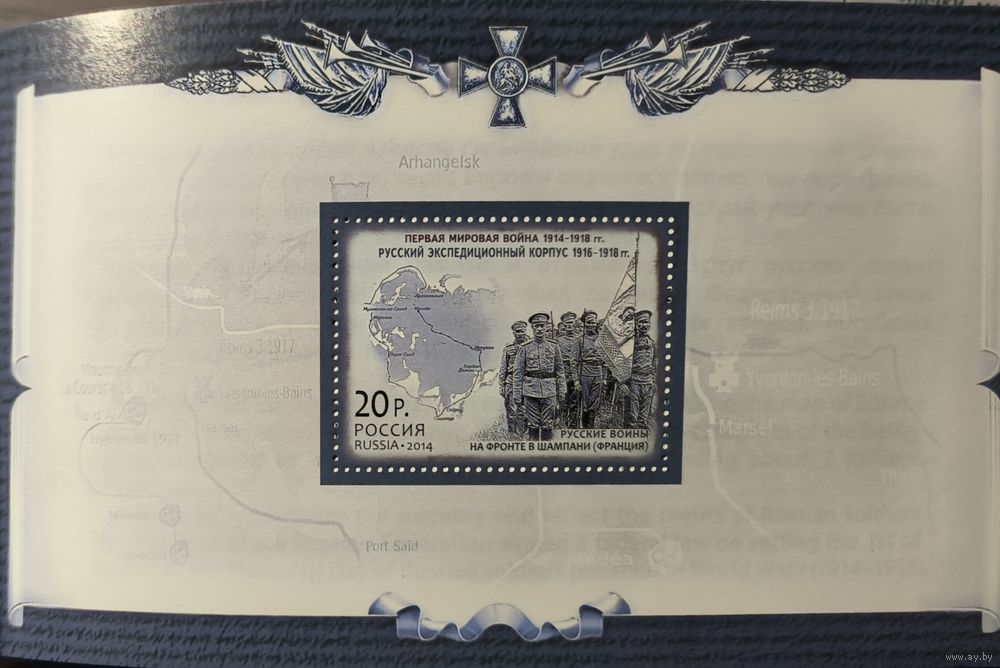Российская Федерация. История 1 мировой войны. Буклет. Марочный буклет состоит из 10 листов и обложки: 4 марочных листа (в каждом по 1 марке) и 6 — с сопроводительным текстом.