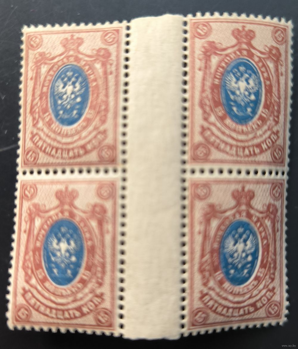 Российская Империя. Девятнадцатый выпуск. Квартблок. 15 коп. № 102 (Загорский). Полоса.