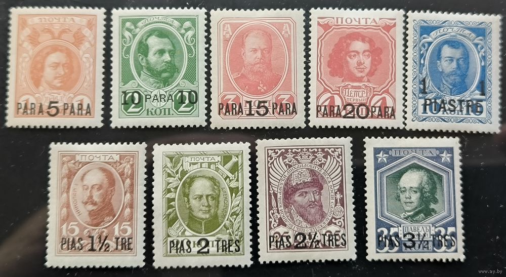 Российская Империя. Русская почта в Турции (Левант). Юбилейный выпуск "300-летие дома Романовых". Специальный тираж марок России с дополнительной печатью турецкого номинала. № 89-97 (Крамаренко). Не полная серия.
