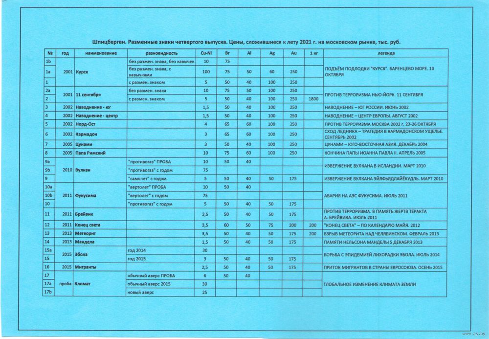 В каталоге представлены все типы и разновидности памятных монет острова Шпицберген, отчеканенные на Санкт-Петербургском монетном дворе в 2001-2015 годах. Монеты отражают значимые события новейшей истории России и Мира. Для каждой монеты даны описание лицевой и оборотной стороны , указаны параметры, приведена цветная фотография и тираж монеты.
