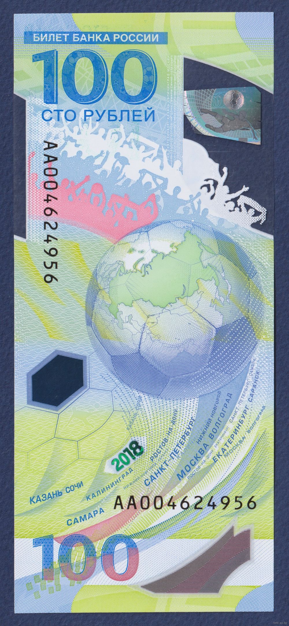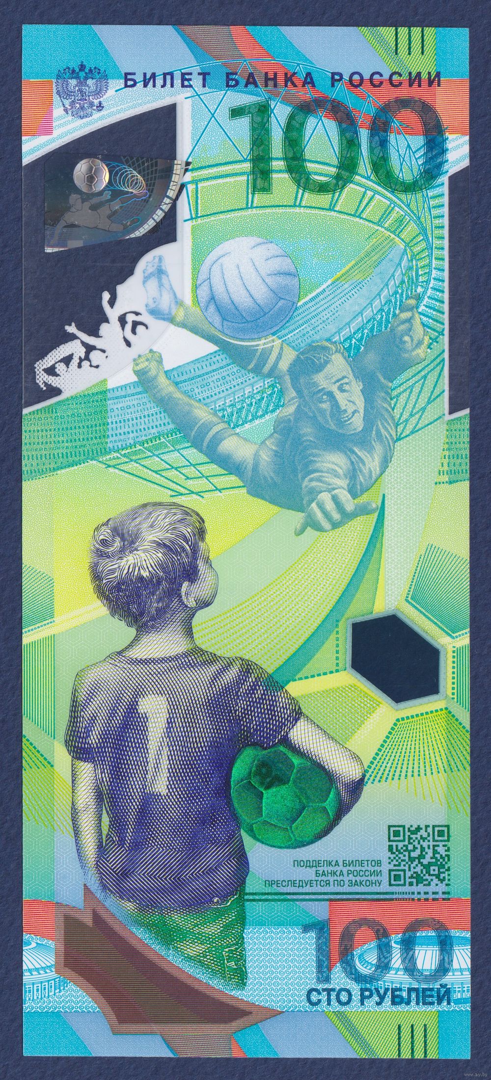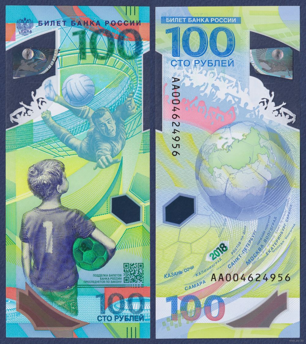 Россия, 100 рублей 2018 г., P-280 (АА, полимер, памятная - чемпионат мира по футболу, Лев Яшин), UNC
