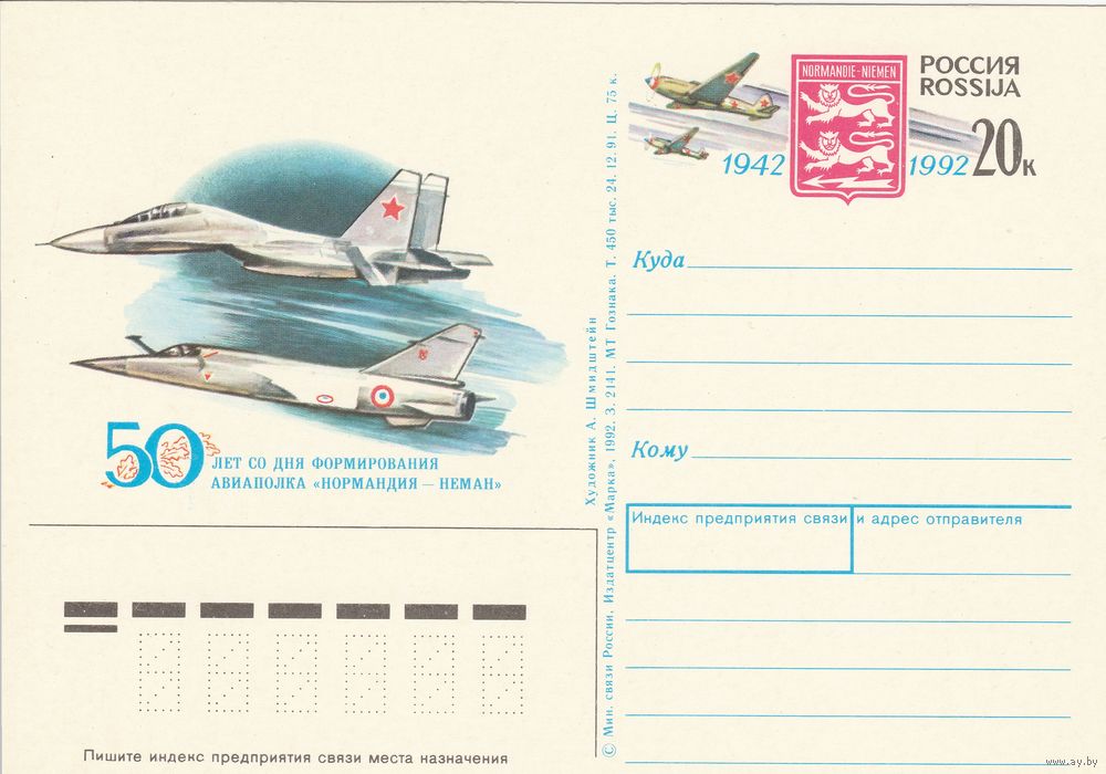 Россия 1992 ПК с ОМ 50 лет со дня формирования авиаполка Нормандия-Неман (к3)