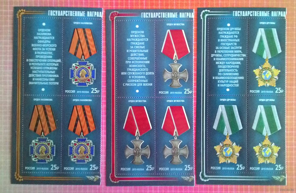 Россия, 2015. Марки серии "Государственные награды Российской Федерации". Угол листа с купонами.