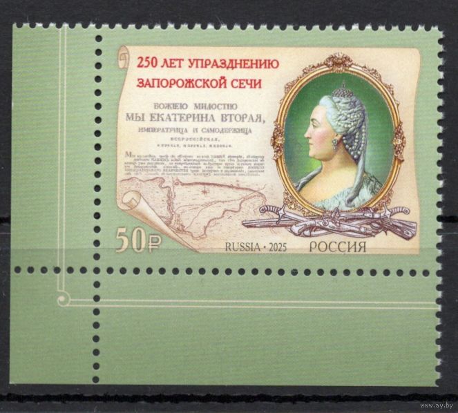 Россия 2025. 250 лет упразднению Екатериной II Запорожской Сечи марка с угловым полем