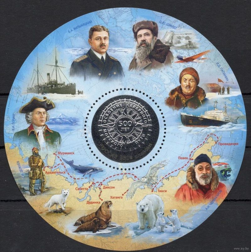 На почтовой марке изображена роза ветров; на полях блока — известные мореплаватели и полярные исследователи России на фоне карты: С.И. Дежнёв, В.И. Беринг, Б.А. Вилькицкий, О.Ю. Шмидт, И.Д. Папанин, А.Н. Чилингаров, а также ледоколы «Таймыр», «Ленин», научно-исследовательский аппарат «Мир-1» и животные, обитающие в северных морях