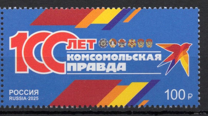 Россия 2025. Газета Комсомольская правда 100 лет 1марка (2808)