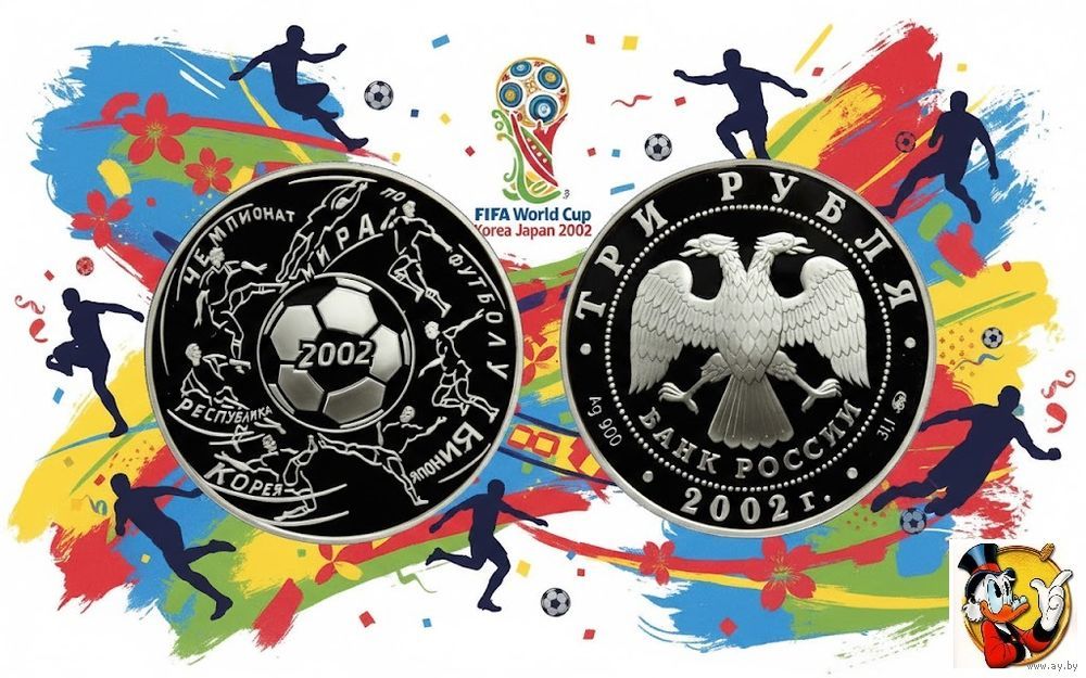 Россия 3 рубля 2002 года. "Чемпионат Мира по футболу. Япония, Южная Корея" ММД. Серебро (Ag 900/34,88 (31.1) грамма). Сторгуй за свою цену, предложи обмен!