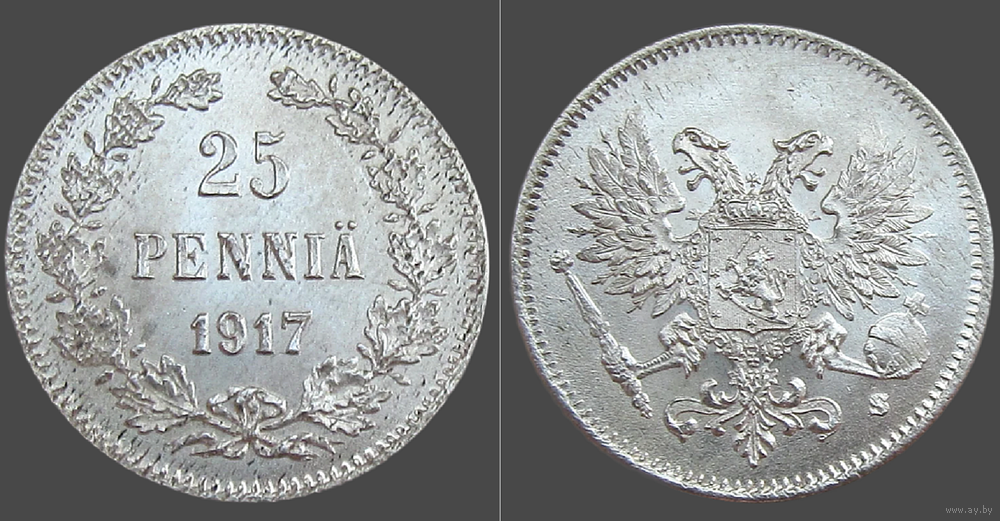 Россия для Финляндии, 25 пенни 1917 г. (S) сост. Unc, серебро 750/ 1,27 г, Биткин #GSF2