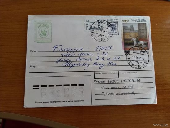Россия конверт реально прошедший почту в тариф с рекламной маркой псковского клуба коллекционеров и марками России маршал Жуков война