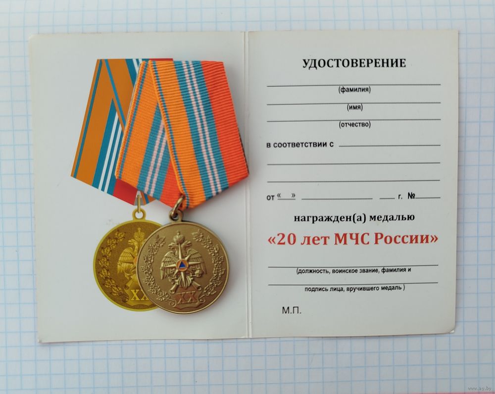 Россия. Медаль "20 лет МЧС" с удостоверением